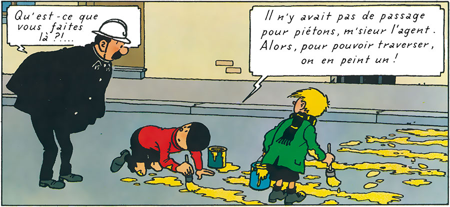 Agent 15: “What are you doing here?!”Quick: “There was no pedestrian crossing, officer. So, to be able to cross, we are painting one!”