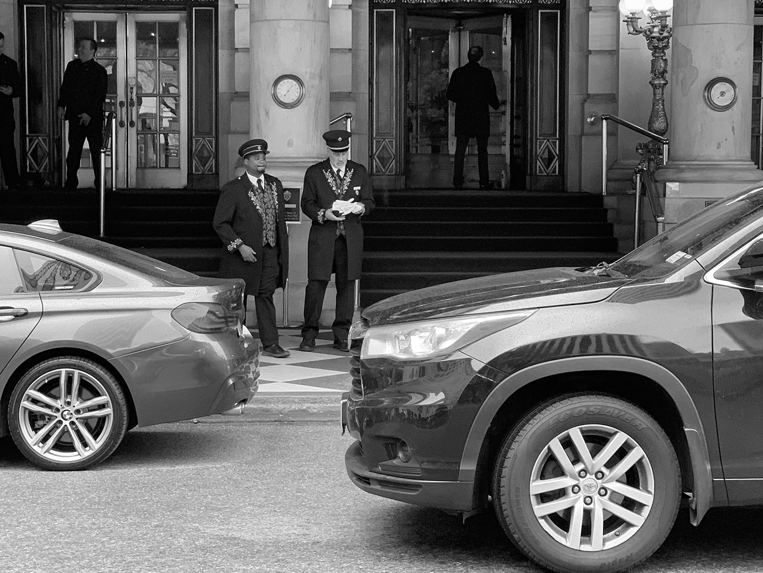 À la descente de voiture, il est le premier à accueillir et orienter la clientèle de l’hôtel parfois aidé du bagagiste-chasseur.