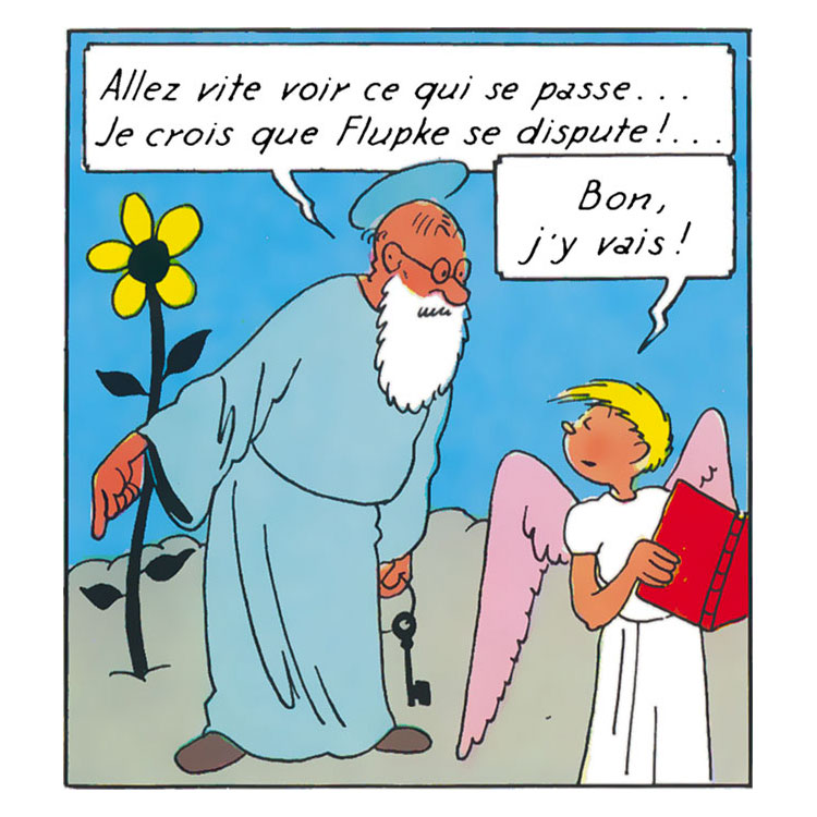 St. Peter: “Go quickly and see what's going on... I think Flupke is arguing!” Flupke’s guardian angel: “OK, I'm going”.
