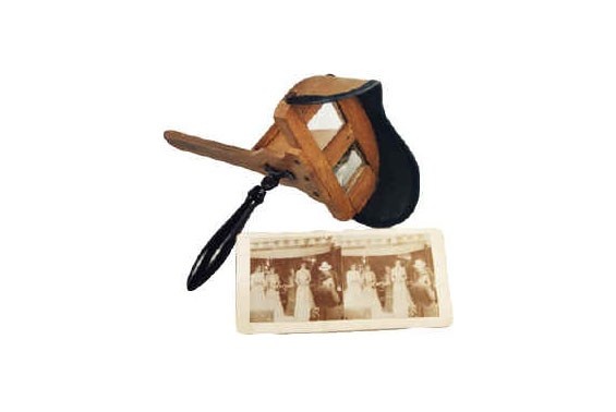 From the eighteenth century, various inventions, which gave rudimentary three-dimensional effects, were created as distractions for the court of Louis XV, as well as in Prussia, Austria and Russia. We were still, however, a long way off from what we today understand as stereoscopic images. The first major difference is that these 3D images were not projected onto a screen or any other surface: the effect was achieved by looking into a candle-lit box via two holes. The box contained static scenes often portraying characters and scenery cut-outs fixed at different distances, as if on a miniature theatre stage. Contraptions called ‘viewers’ were accordion-like structures which were stretched out before the eyes in order to admire exotic landscapes, compositions based on the novels of Jules Verne, etc. But it seems that the first true stereoscopic image dates from 1838, and was created in France. In reality, two slightly different images are brought together in one viewer; the eyes see the images and the brain processes them to create the illusion of three dimensions.