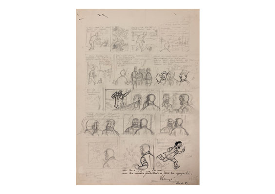 Never buy a framed 'original' tucked away behind a layer of glass: take the time to examine the document itself. The paper can tell you a lot about a drawing. Was the paper commonly used at the time when the drawing should have been made? Inks have changed over the years as synthetic elements have been added. Hergé remained quite faithful to the particular brands of paper and ink that he used. If the work in question is a rough draft, it is worth bearing in mind that Hergé's notes spilled over onto the margins of the page and he often covered pages in sketches, memos and multiple attempts to catch the perfect line, which could cover the back of the page as well as the front. A specialist can easily identify Hergé's authentic style.