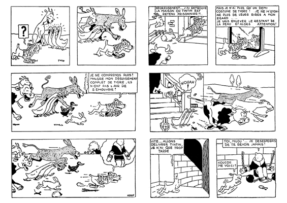 In 1906, Les Fables de la Fontaine were published with illustrations by Benjamin Rabier. The book was republished many times, and Hergé wrote the preface for one of the editions. The creator of Tintin openly acknowledged the influence of Rabier's unique animal drawings, and the debt he owed to the author. In 1929 Benjamin Rabier was leafing through the pages of a magazine and discovered, for the first time, the trials and tribulations of a certain Tintin, who was on an adventure in the heart of the Soviet Union. On pages 126 and 127, a few grinning animals - a donkey, a lamb, three geese and a rabbit - that look like they come straight out of the adventures of Gédéon (published in 1923), can be seen walking along. On the second strip of page 127 we come across a cow who is the spitting image of La Vache qui rit ! Stranger still, in 1898, Rabier had illustrated a series telling of the daily pranks of a little scallywag called Tintin-Lutin.