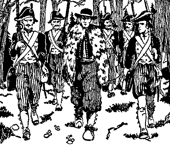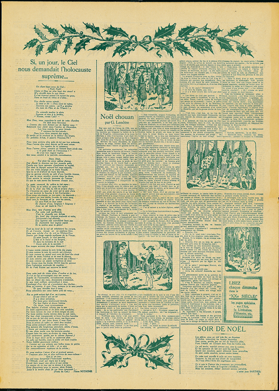 « Noël chouan » is a Christmas story written by Georges Lenôtre, which Hergé illustrated for publication in Le Vingtième Siècle in 1927. The story evokes the beauty of Christmas, even in the midst of war. In 1795, at the time of the Great Terror, French soldiers fought against the Chouans (royalist insurgents). Georges Lenôtre tells the story of a small troupe of soldiers who, having captured a Chouan, plan to take him back to their camp in order to execute him – in those days being captured meant certain death! Before setting off for camp the soldiers and their captive are sitting around a fire, when suddenly church bells start to ring for Christmas Midnight Mass. As the sound of the bells and the beauty of the holy night penetrates the men's hearts, the cruelty inside them melts and their hearts open as they recall happy memories. Images of snowmen, gifts and smiling children are all evoked in the middle of the darkness. The soldiers become human beings again as they share stories, and they decide to free their prisoner so that at least one of them may be able to rejoin his family. Then they set off back to camp. The horrors of war return quickly, but for a moment at least and thanks to Christmas, grace and humanity shine through the darkness.