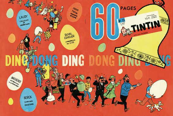 On 1 April 1953, readers of the Belgian edition of Tintin magazine celebrated Easter with their favourite heroes: Tintin, Snowy, Captain Haddock, Professor Calculus and the Thom(p)sons. Hergé’s spectacular illustration, drawn from a low angle perspective, depicts the characters enthusiastically ringing an enormous Easter bell.