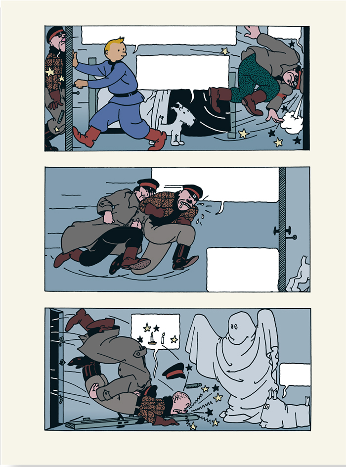- Lithographic print / interpretation, from pages 36, 37, 38, 39 and 40 of the adventure of Tintin reporter du petit « Vingtième » au pays des soviets, drawn and written by Hergé in 1929.