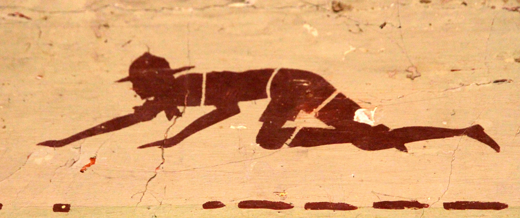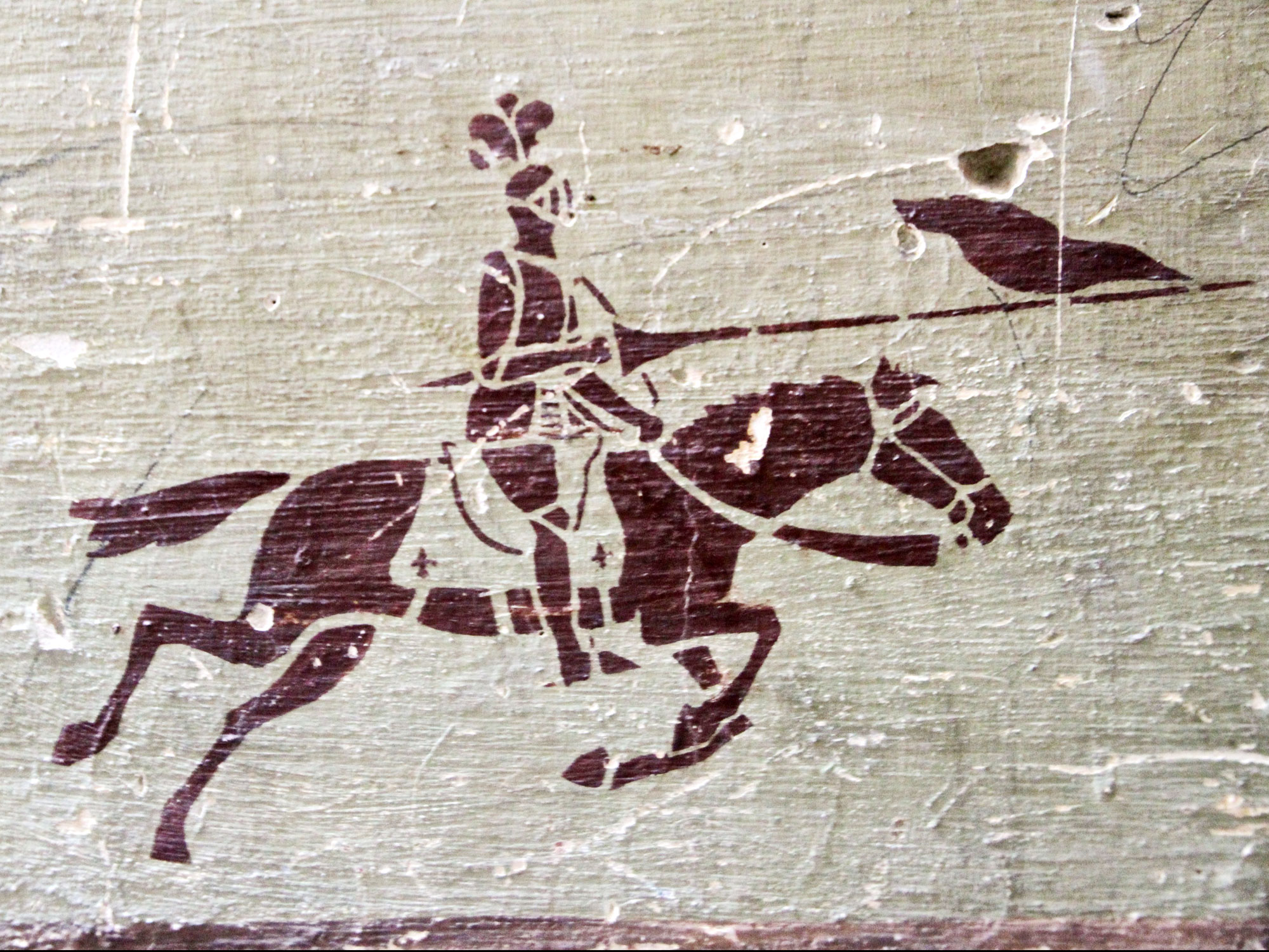 which had been placed at their disposal. The one before us (8.80 x 3.5 x 3 m) is on the ground floor of the house adjoining the chapel. The Unit's troop leader entrusted the project to a certain Georges Remi, the future Hergé, who, at the age of 15, completed the decor with the scouts of his patrol in the spring of 1923. The budding artist created stencilled friezes with 35 galloping knights one metre above the ground, as well as 52 American Indians and scouts alternating on all fours at ceiling level.