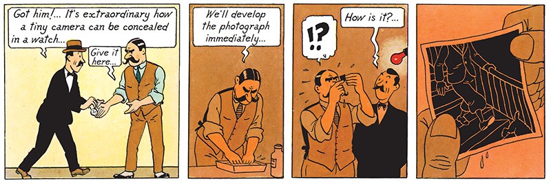 The cartoonist takes the opportunity to show the technological advances in this field. To do this, he equips a man named Sporovitch with a state-of-the-art miniature camera that fits in the hand or rather... inside a pocket watch. Thanks to this sophisticated gadget - worthy of James Bond - he photographs Tintin and Snowy without their knowledge. Neither seen, nor known. Discreetly... "click, click, it's in the bag"! It's a pity that he isn’t good at framing. Still, with this failed photo, Hergé judiciously integrates an image within an image, thus creating a kind of mise en abyme.