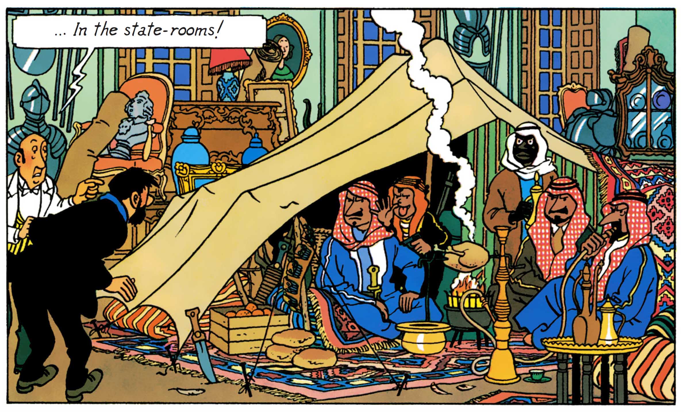 And if he doesn't go to foreign culinary practices, they come to him... or rather, invite themselves into his friend’s home, as is the case in The Red Sea Sharks, when the men of Emir Mohammed Ben Kalish Ezab take over Captain Haddock's living room to set up - as they usually do in the desert - a Berber tent. A pretty little corner of Arabia under the gilding of Marlinspike Hall. A change of scenery and good roasted food guaranteed!