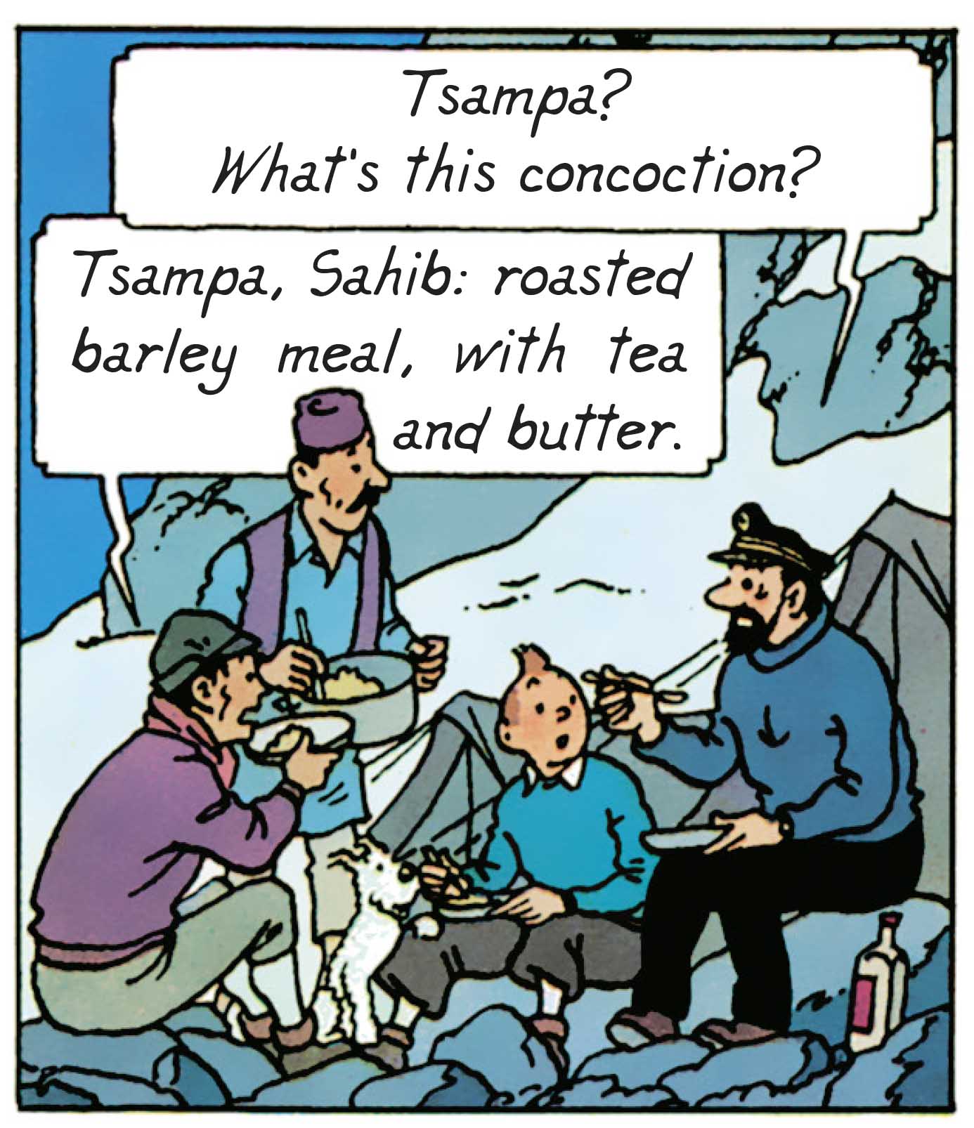 In his geo-taste tour of the world, Tintin always makes a point of sampling local specialities, even in the most remote or unusual places. So it was on the mountaintops, during his journey to the land of the Yeti, that he tried Tibetan cuisine for the first time. In this case, Tsampa. This easy-to-preserve and transportable dish lends itself well to impromptu picnics at high altitudes.