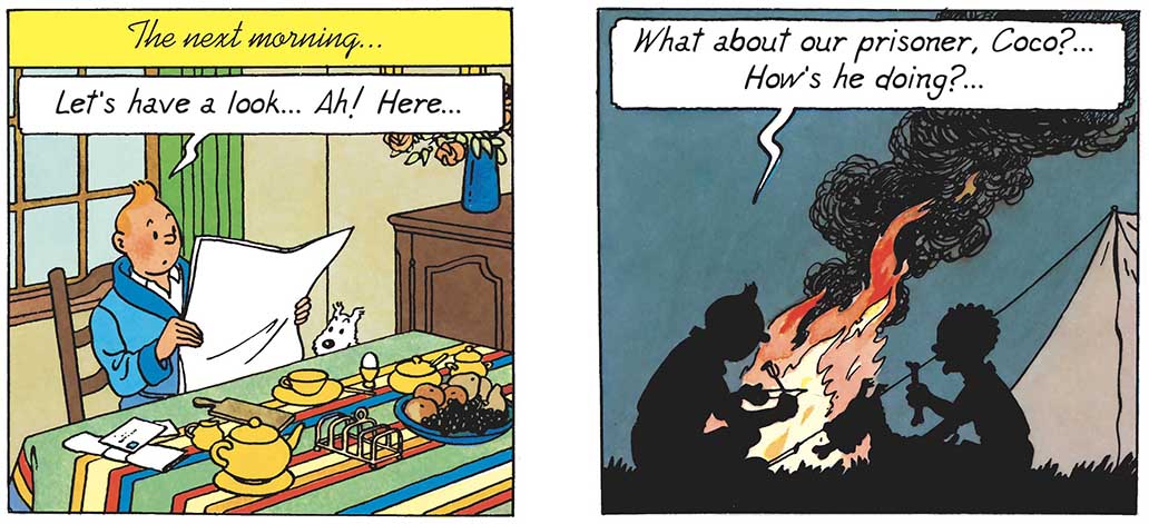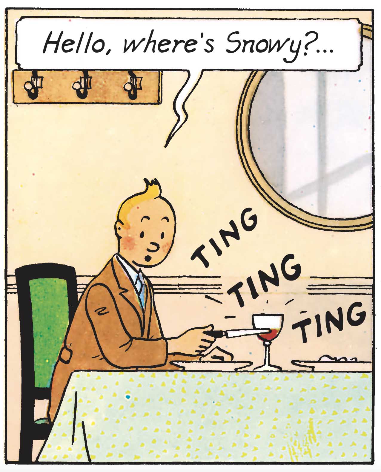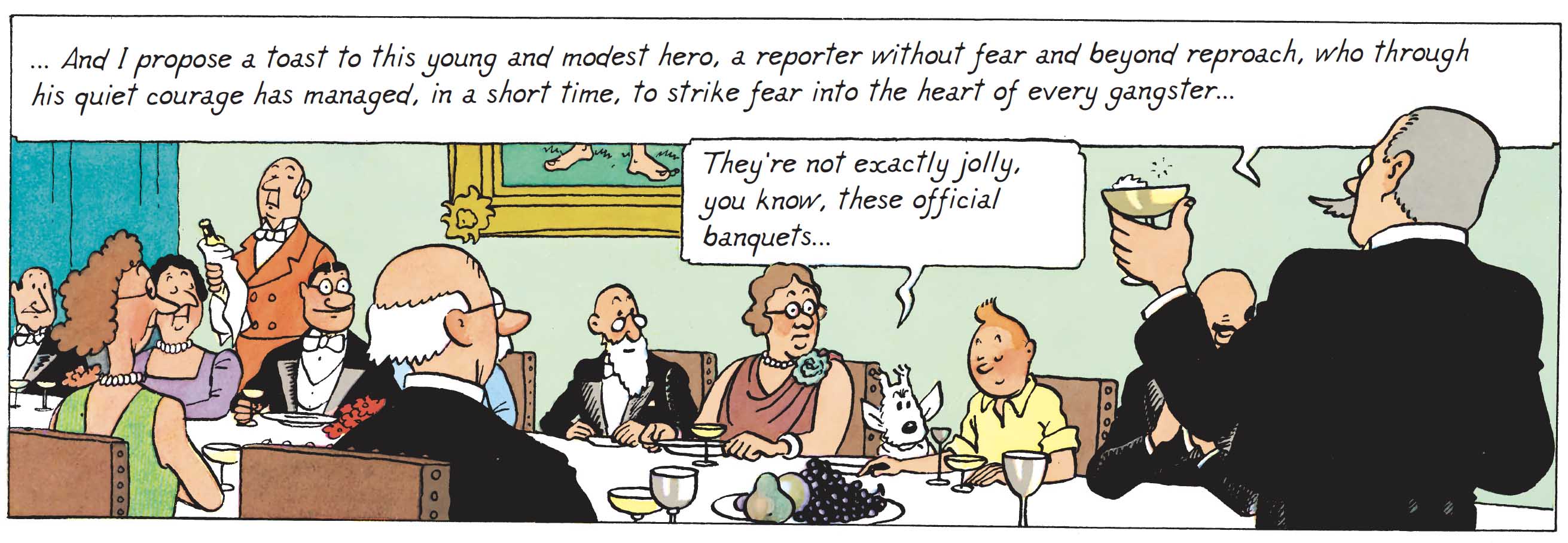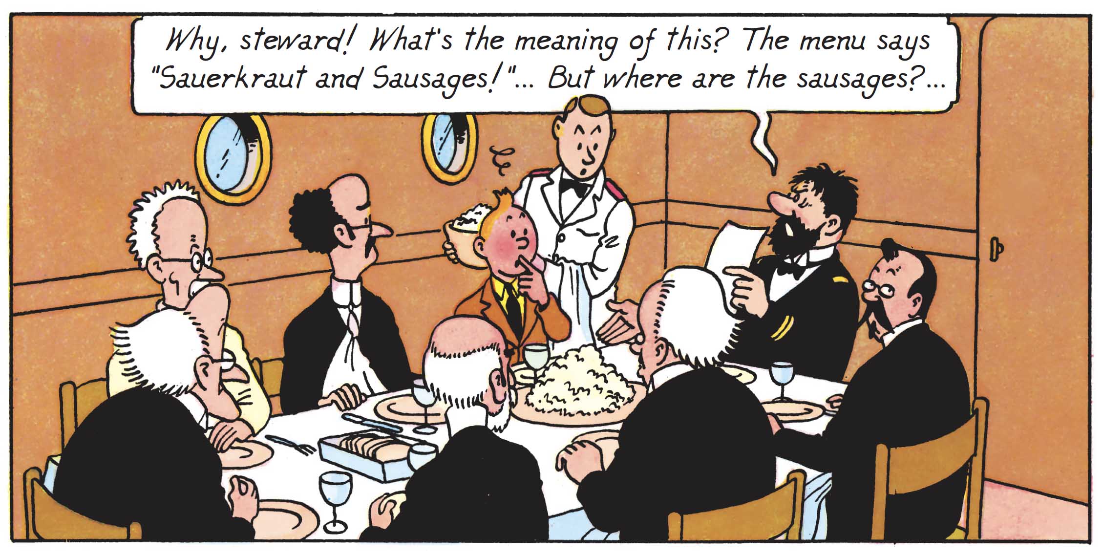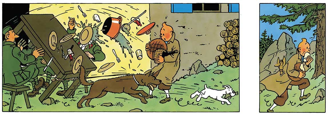 In Hergé's work, meals are a simple and effective indicator of time, since, depending on the type eaten, they implicitly indicate to readers the precise time of day during which the sequence takes place.