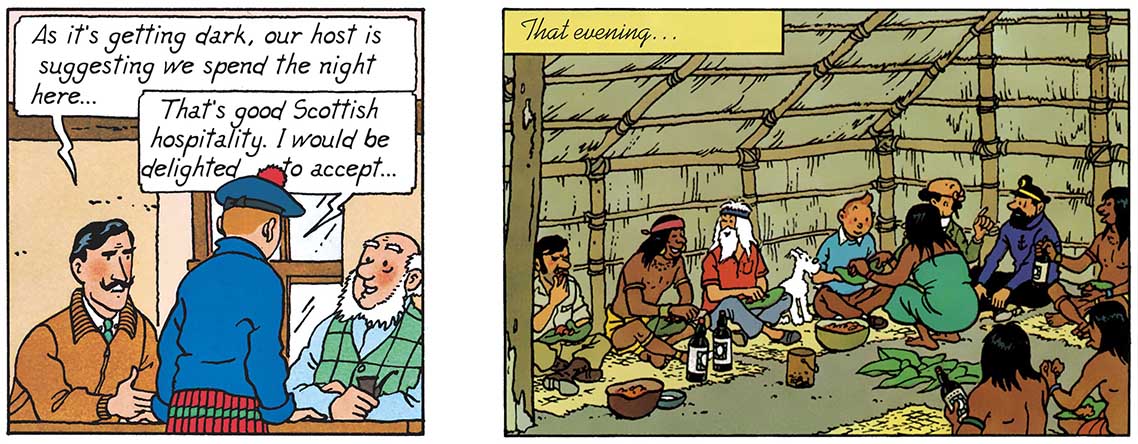 Where there's friendliness, there's usually hospitality, as the two concepts often go hand in hand. So it's hardly surprising that in The Black Island, Tintin is warmly received - and welcomed, too - by the proprietor of an inn. The innkeeper offers him clothes, room and board. Enough to get him back on his feet after a chaotic, bumpy flight. When it comes to hospitality, the Picaros are not to be outdone either, as it's in the hut of the Kaloma chief that he is received as a guest of honour, in the company of his faithful acolytes. Each meal shared with the local people is a golden opportunity to forge strong socio-cultural links. Strong because respectful, fraternal and sincere.