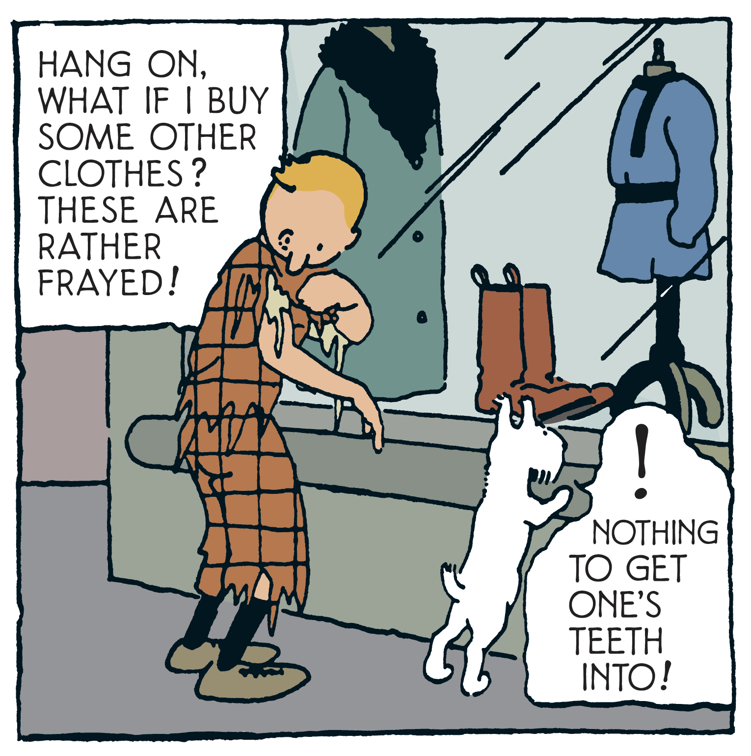 In short, thanks to the ready-to-wear shops, our favourite hero can change his mind... well, his clothes and his shirts, in the space of just a few vignettes. How handy is that?
