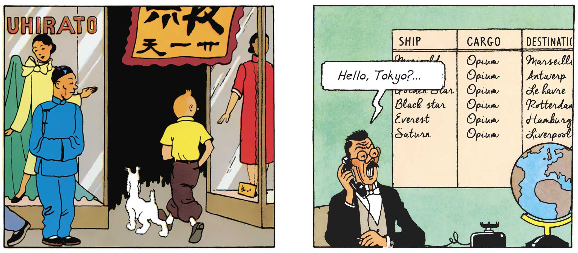 Mitsuhirato's shop - ironically located on the Street of Tranquility - is a good example. The man who acts as a go-between for Rastapopoulos and a cameo for the Japanese has absolutely nothing in common with a shopkeeper. This drug baron conducts his fraudulent activities directly from the back room of his establishment, in a comfortable office worthy of The Godfather.