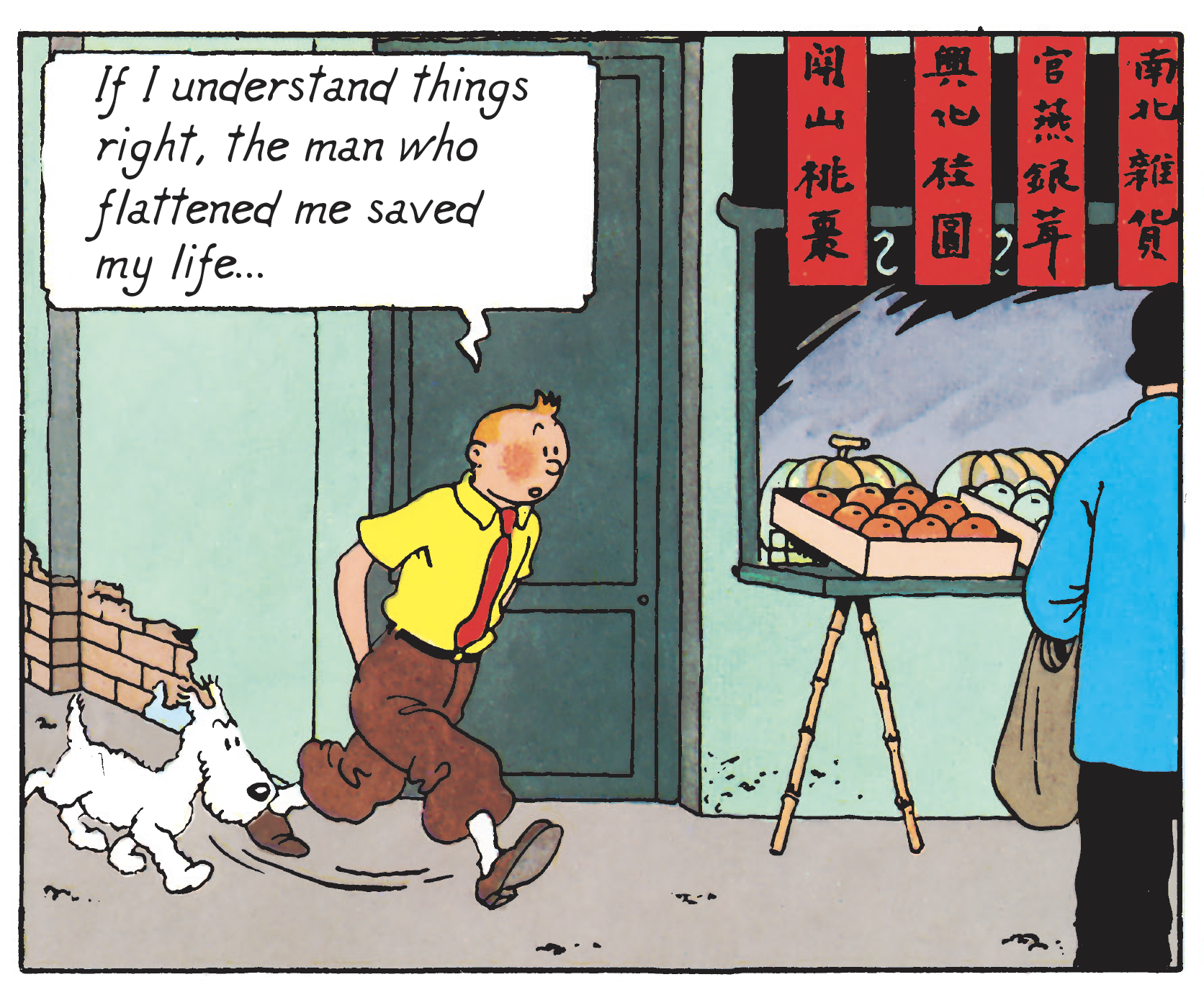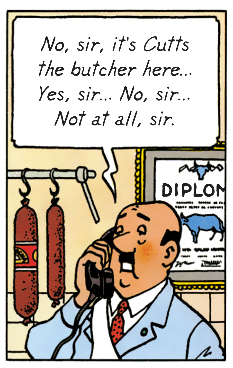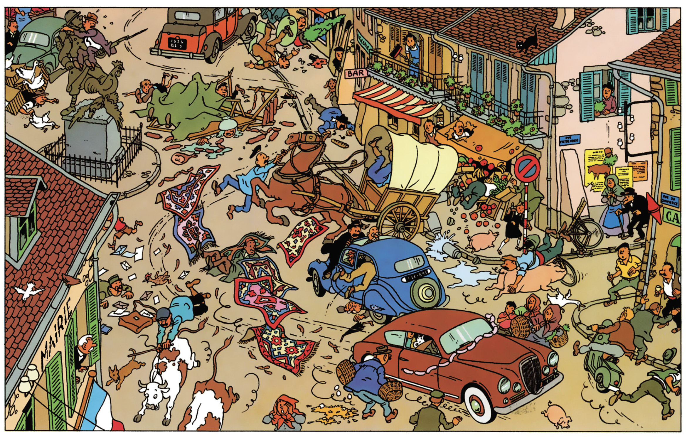 Then in The Calculus Affair, Tintin and his sidekicks also dust off the sales techniques traditionally practised in markets. Italian, in particular. By driving his car into the middle of the stalls, he unwittingly - and well before his time - invented the concept of the "drive-in" or "drive-through". Thanks to this, he can take away a string of sausages without getting out of his car. Fast. Practical. Especially when you're in a hurry. Avanti!