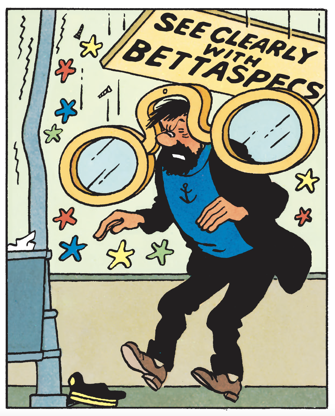 And yet Hergé had set the tone. In addition to the "physical" gag, the cartoonist took care to write a slogan that was as hard-hitting as it was far-sighted: "To see clearly, Leclerc glasses". A tagline that almost sounds like a subliminal message. As if Hergé were advising his character, and his readers, to keep their eyes open... but the right ones!