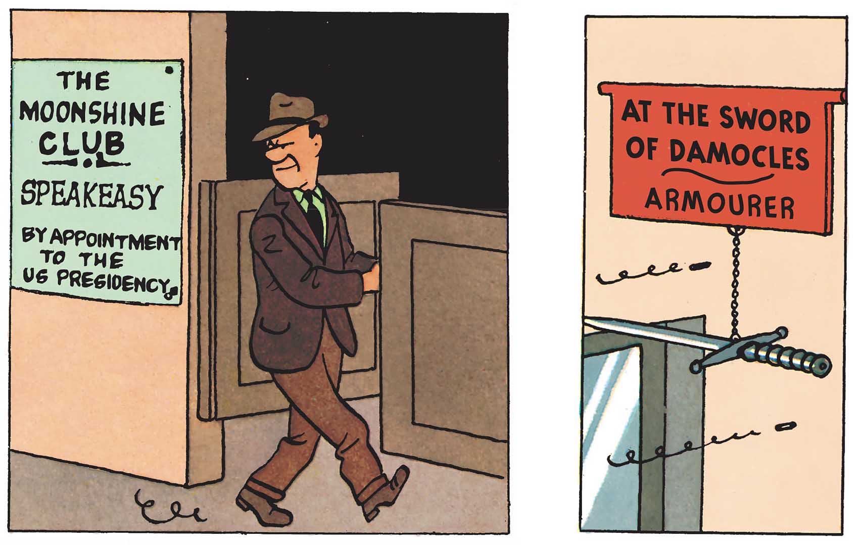But the right one! Why? Because, throughout the adventures, he has had fun slipping amusing notes of humour into these advertising materials. In the French edition of Tintin in America, for example, the clandestine distillery run by the local mafia is called "The moonshine club". So there's no deception here, since everything is clearly stated because it's the name of a smuggled spirit.