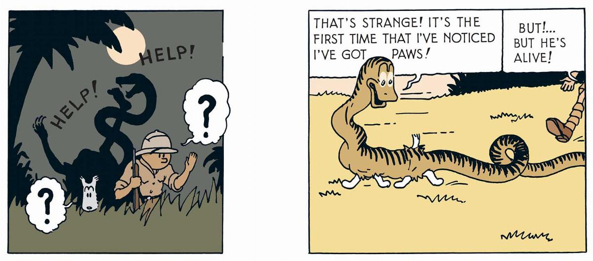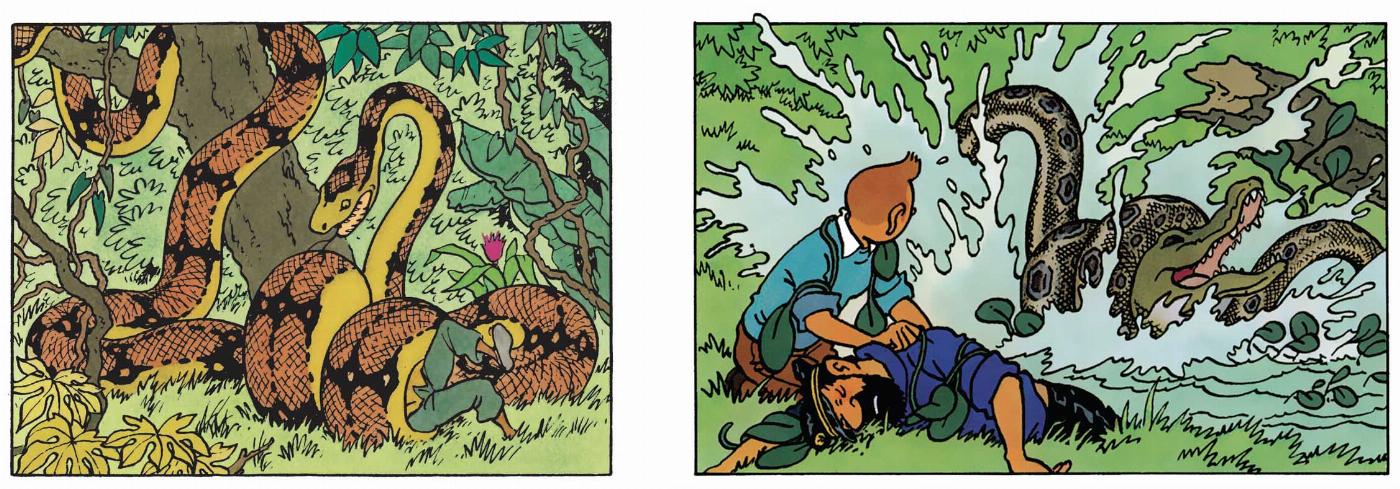 It's in the Congo - and twice - that snake-like creatures make their appearance in the young reporter's African adventures. First, they surreptitiously attack the leopard-man hiding behind Tintin, before swallowing Snowy like a mouthful of bread. Part protector, part aggressor. From the outset, snakes reveal their ambivalent nature.
