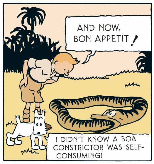Thanks to this, it's close to the symbol. So close, in fact, that Tintin doesn't hesitate to add the finishing touch himself, to complete the circle and transform - once and for all - this common reptile into Ouroboros, the mythical snake that bites its own tail.