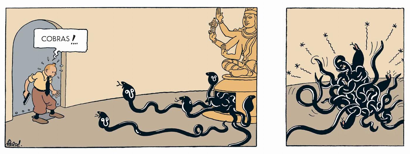 For Tintin, of course! Because in India, in Cigars of the Pharaoh, Hergé reserved for his intrepid hero an encounter with numerous snakes that he could have done without, unknowingly hijacking the words of philosopher Klaus Wentz as follows: "Wherever the snake(s) emerge(s), a god precedes (them)".