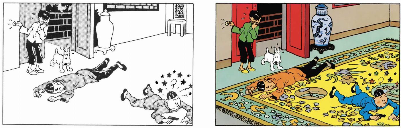 It's worth noting, however, that in the original black-and-white version of the adventure, published in 1936, his appearances were rarer than in the completely reworked and colorised 1946 version. The background is sometimes reduced to its simplest form - or even absent altogether - so as not to detract from the legibility of the action.