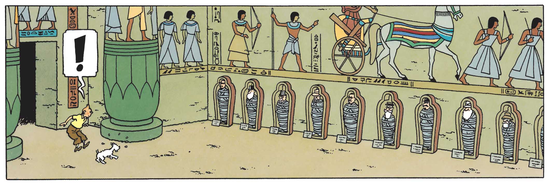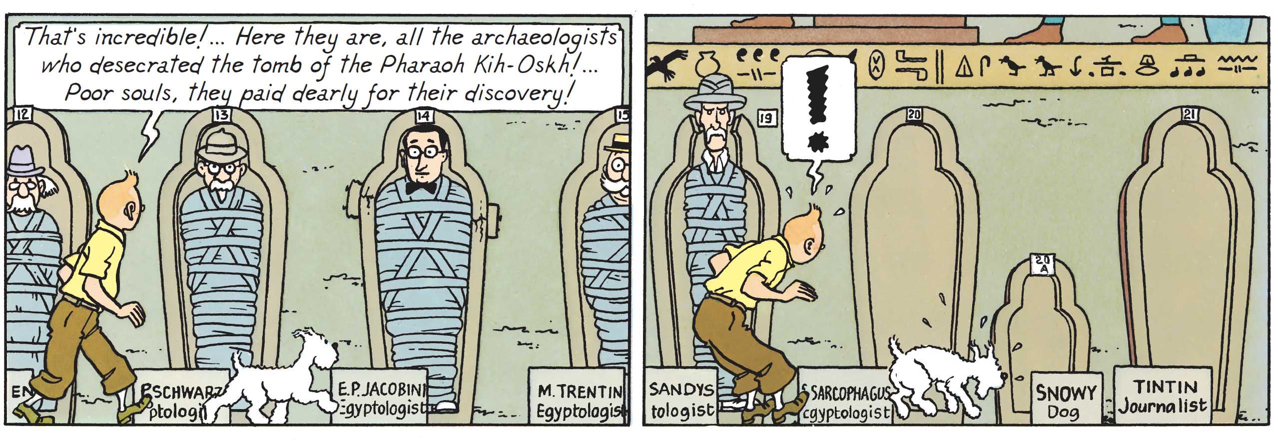 In Cigars of the Pharaoh, Tintin ventures into a sort of hypogeum, where eerily modern-looking mummies lie — those of scholars who dared to desecrate the tomb of Pharaoh Kih-Oskh. Tintin and Snowy themselves are not spared from the terrifying curse.