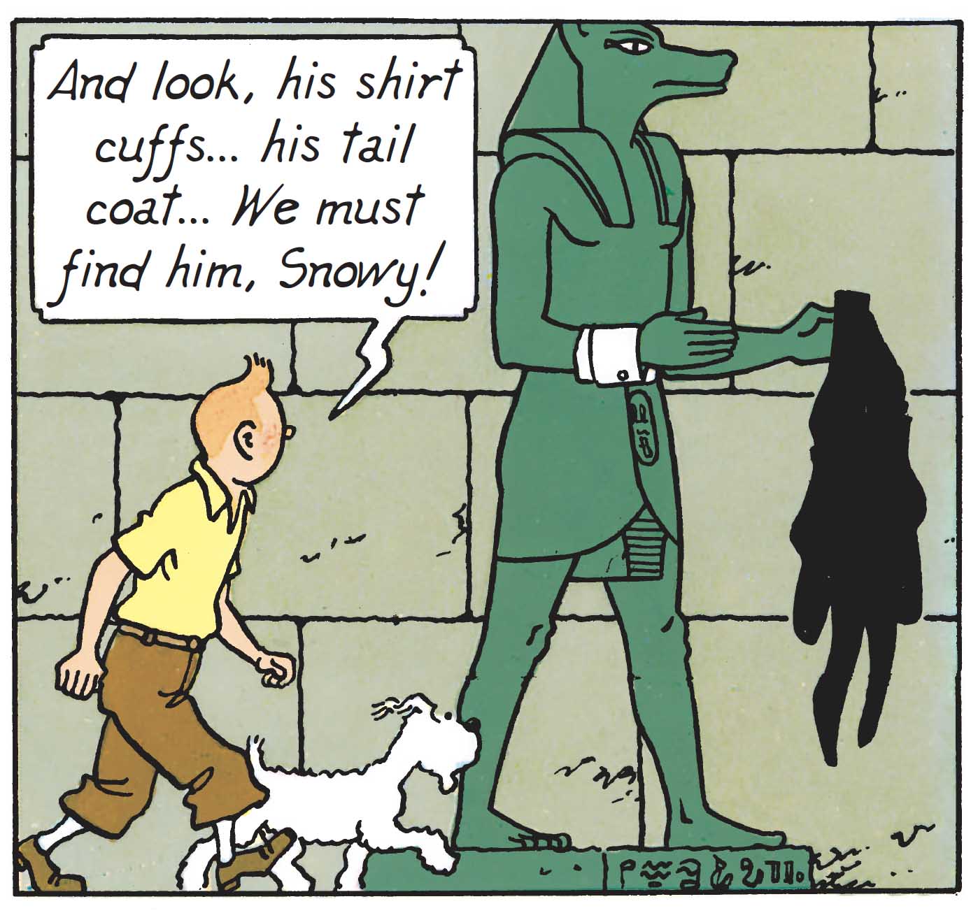 This scene is deeply rooted in the great wave of Egyptomania that, from the 19th century onward, captivated the collective imagination, fueled by archaeological expeditions and the rediscovery of ancient splendors. The fascination reached its peak in 1922 with the uncovering of Tutankhamun’s tomb, an event Hergé subtly echoes through striking details. Among the paintings and hieroglyphs, for instance, stands a statue of Anubis. As a warning, the ever-watchful guardian of the tomb has even seized the overcoat of the Egyptologist Doctor Sophocles Sarcophagus.