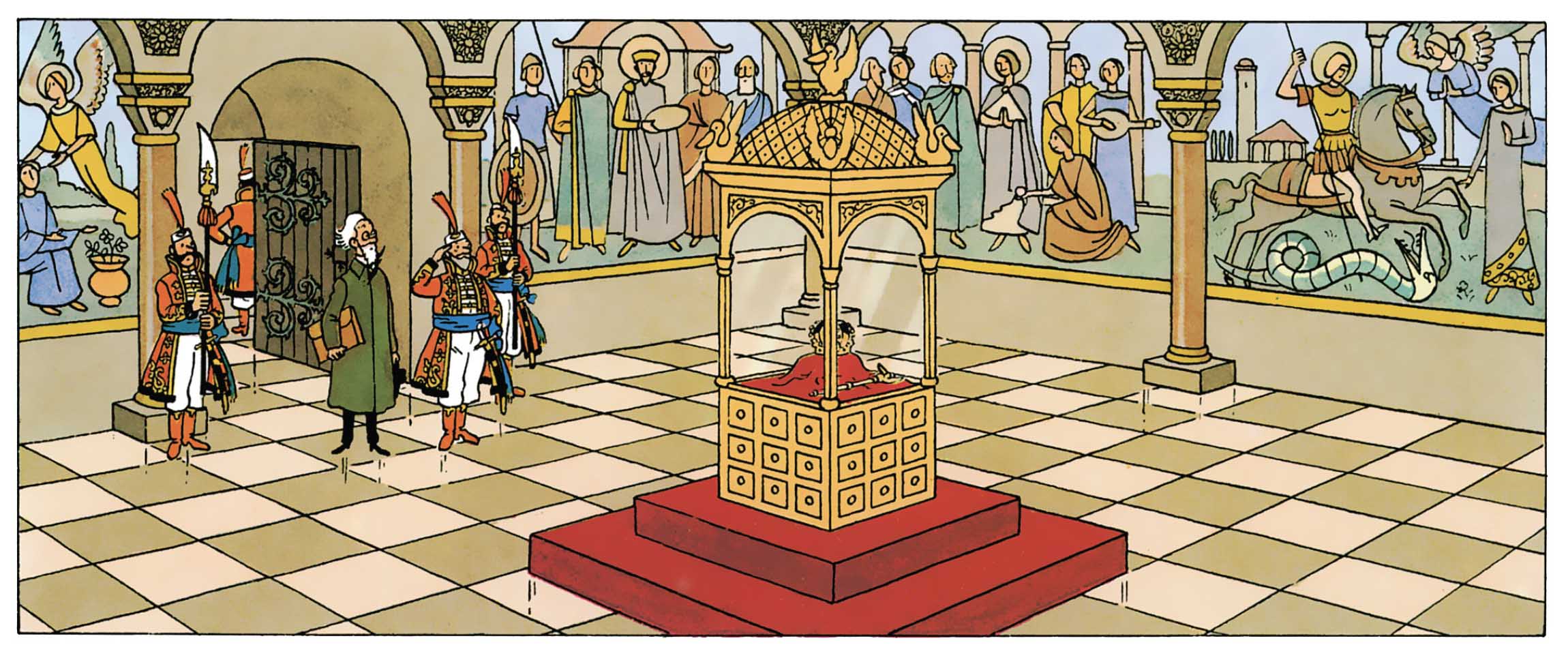 Why settle for mere treasure when a single object can determine the fate of an entire kingdom? In King Ottokar’s Sceptre, the royal artifact at the heart of the story becomes the focus of a conspiracy with deep historical implications. The sceptre of Ottokar IV, the crown jewel of Syldavia’s treasury, is displayed against a backdrop of ancient frescoes.