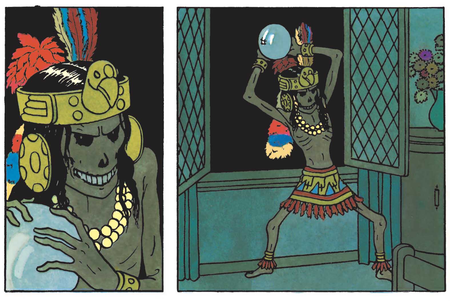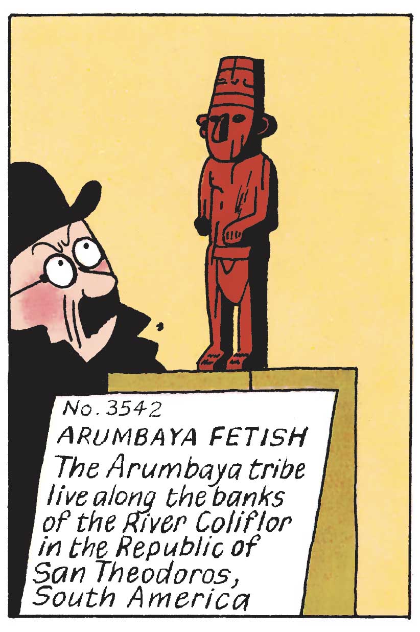 This counterfeit ethnographic artifact, distinguished by its missing ear, evokes the ritual sculptures of South American cultures, particularly those of the Chimú people. While the Arumbaya tribe itself is fictional, it draws from Amazonian lore, reinforcing the story’s exotic atmosphere. Far from being a mere decorative element, this museum piece plays a crucial narrative role, embodying both a fascination with distant cultures and the intricate mechanics of mystery at the heart of the album. Who would have thought that even a broken ear could make so much noise?