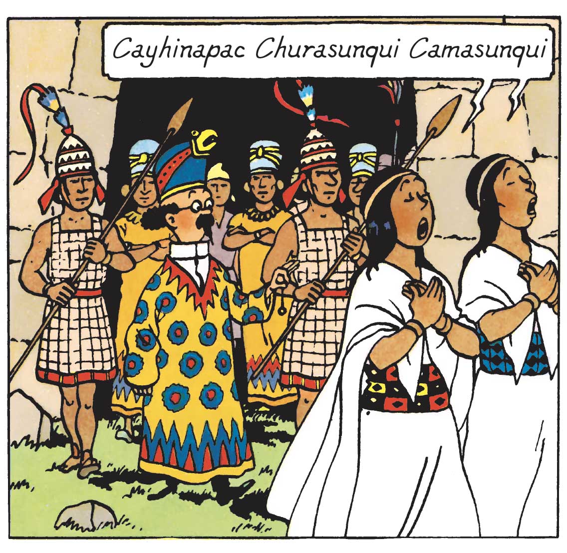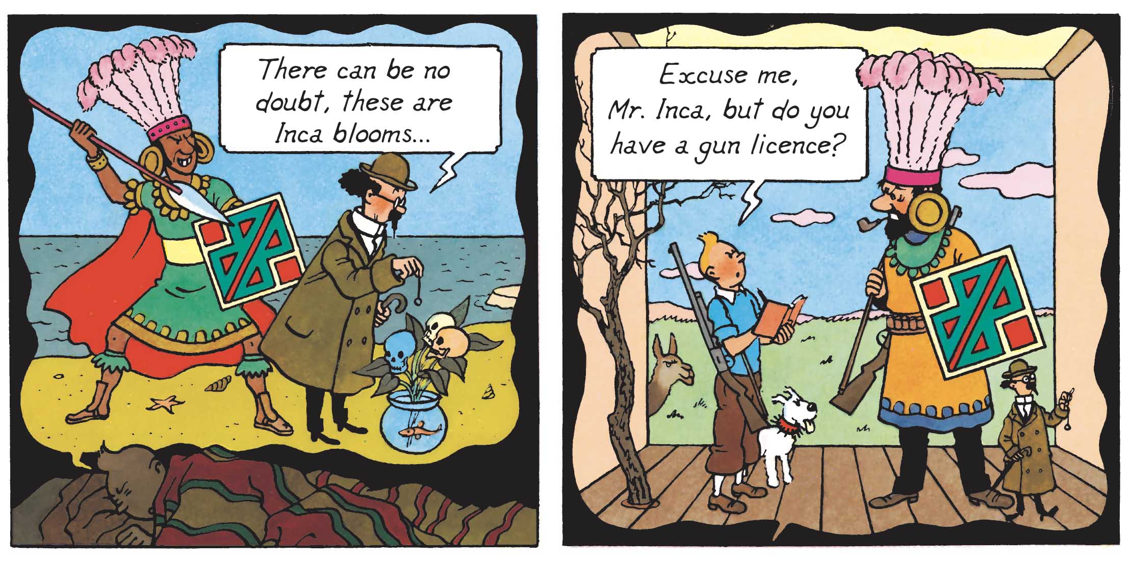The omnipresence of gold reflects its sacred status in Incan culture. Additionally, the ceramics and textile patterns featured in the story are characteristic of Andean civilizations, though certain Mochica and Tiwanaku influences create minor historical anachronisms. Despite taking some creative liberties, Hergé meticulously based his depictions on various sources, including Peru and Bolivia by Charles Wiener, the February 1938 issue of National Geographic — particularly an article by Philip A. Means — and engravings by painter Herbert M. Herget. These references helped him accurately portray Incan clothing in Prisoners of the Sun.