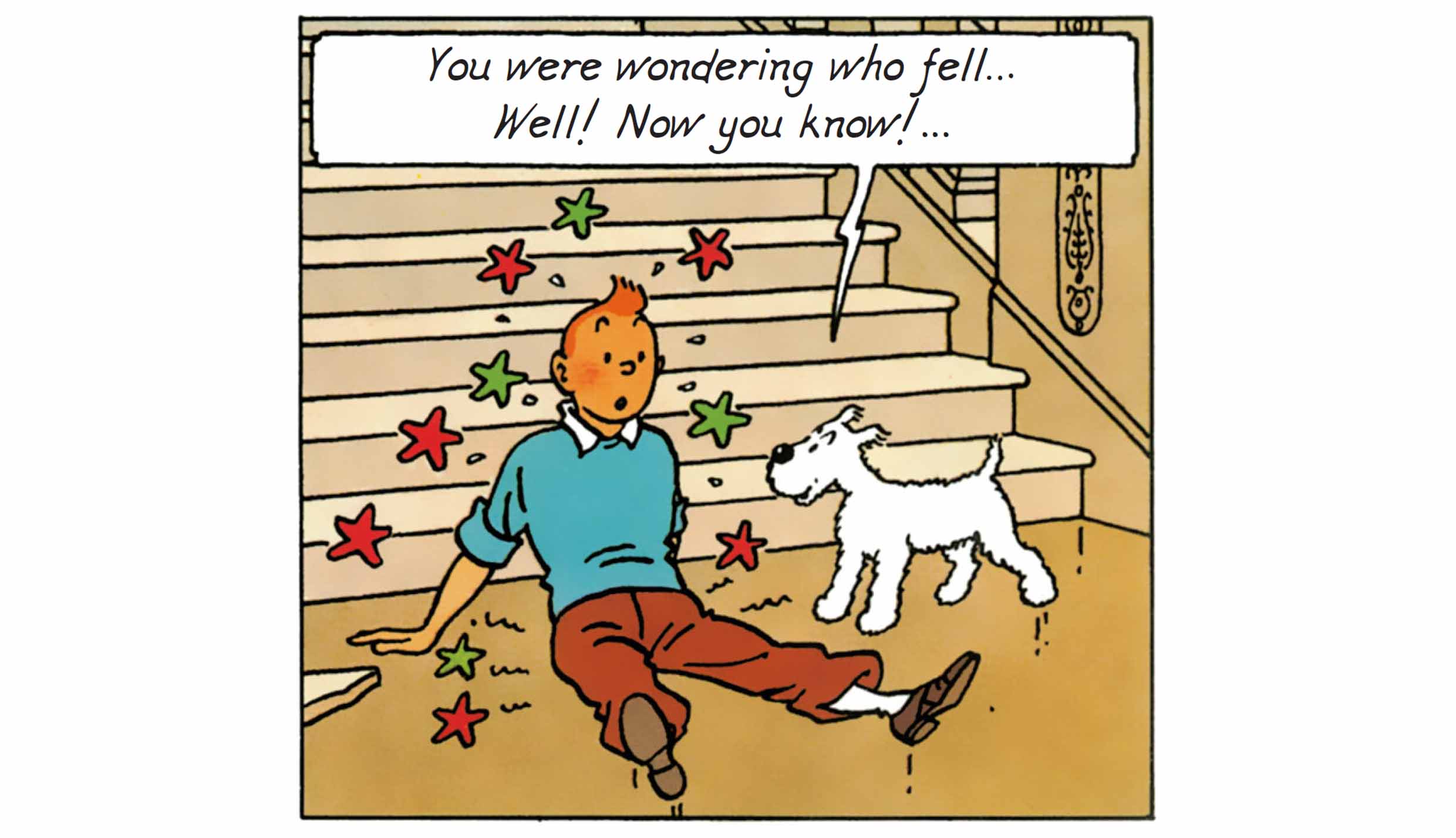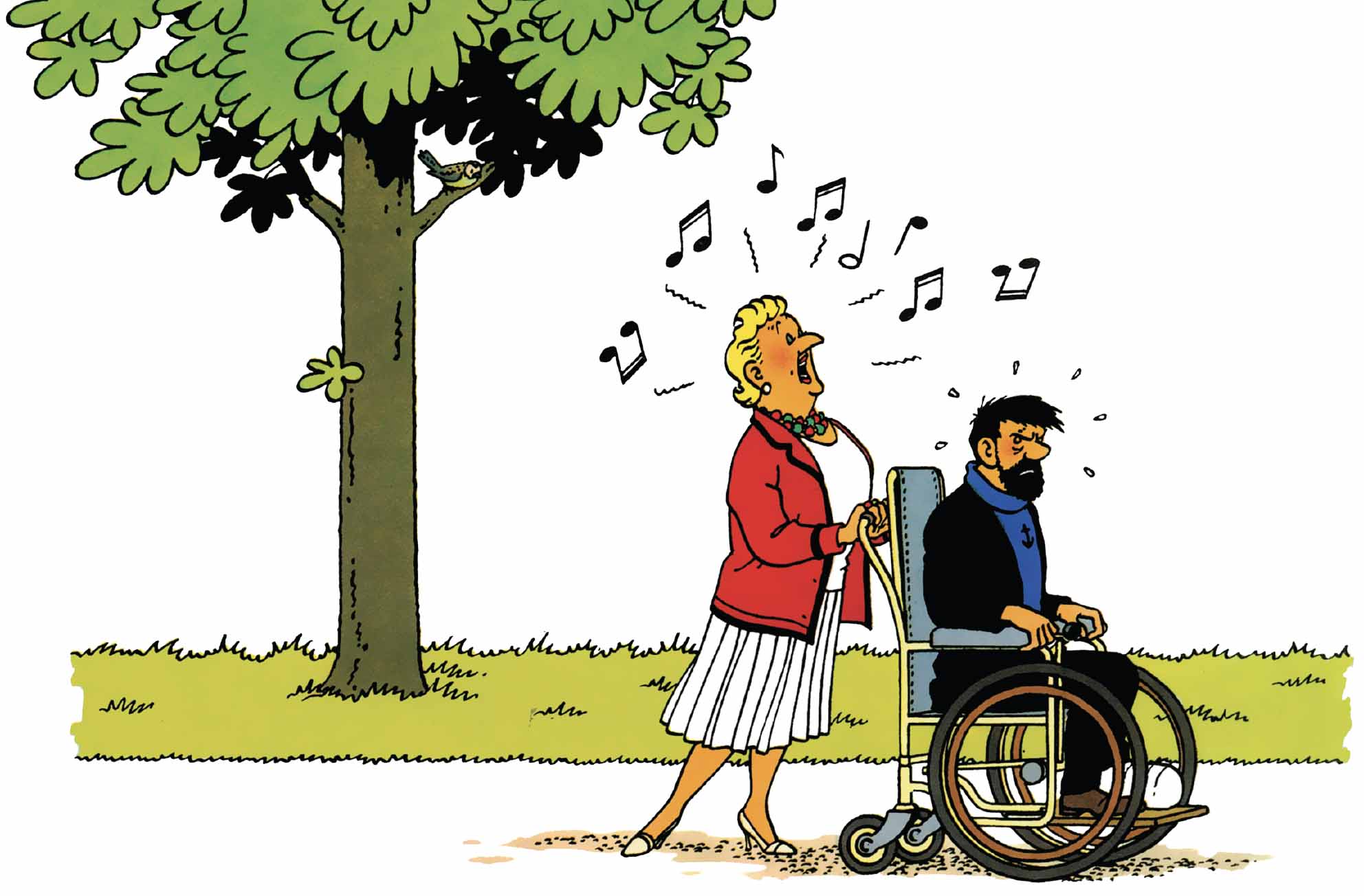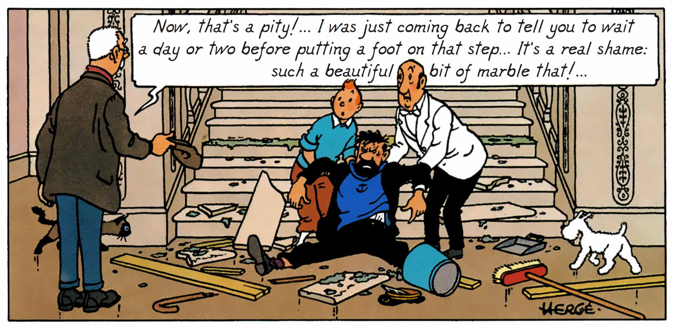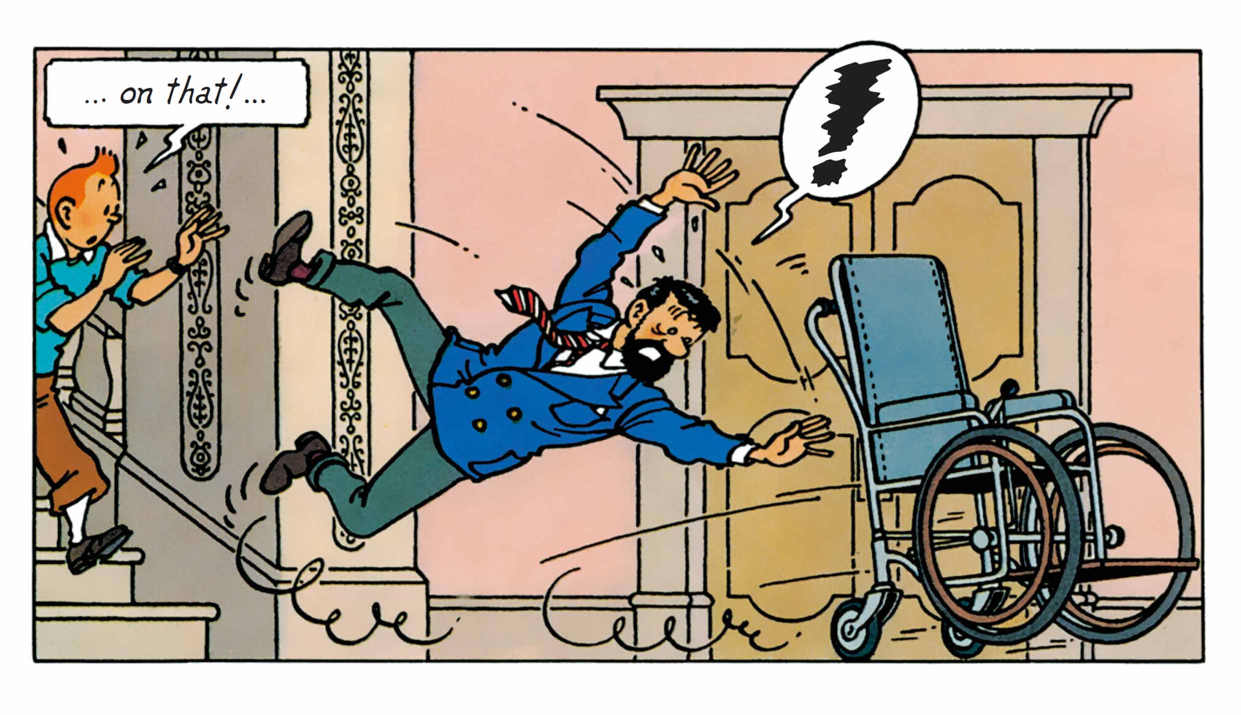 Captain Haddock is at the heart of this comic mechanism : he tumbles down the stairs, struggles to reach the stonemason, and never manages to find peace. These gags are never one-offs: they reappear — sometimes identically, sometimes with slight variations — always with the same visual impact. Haddock’s physical comedy reflects his loss of control in the face of his domestic space being invaded by uncontrollable outside forces (Castafiore, journalists, technicians, gypsies...).