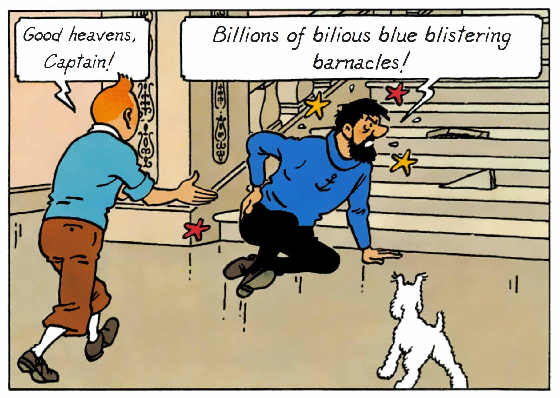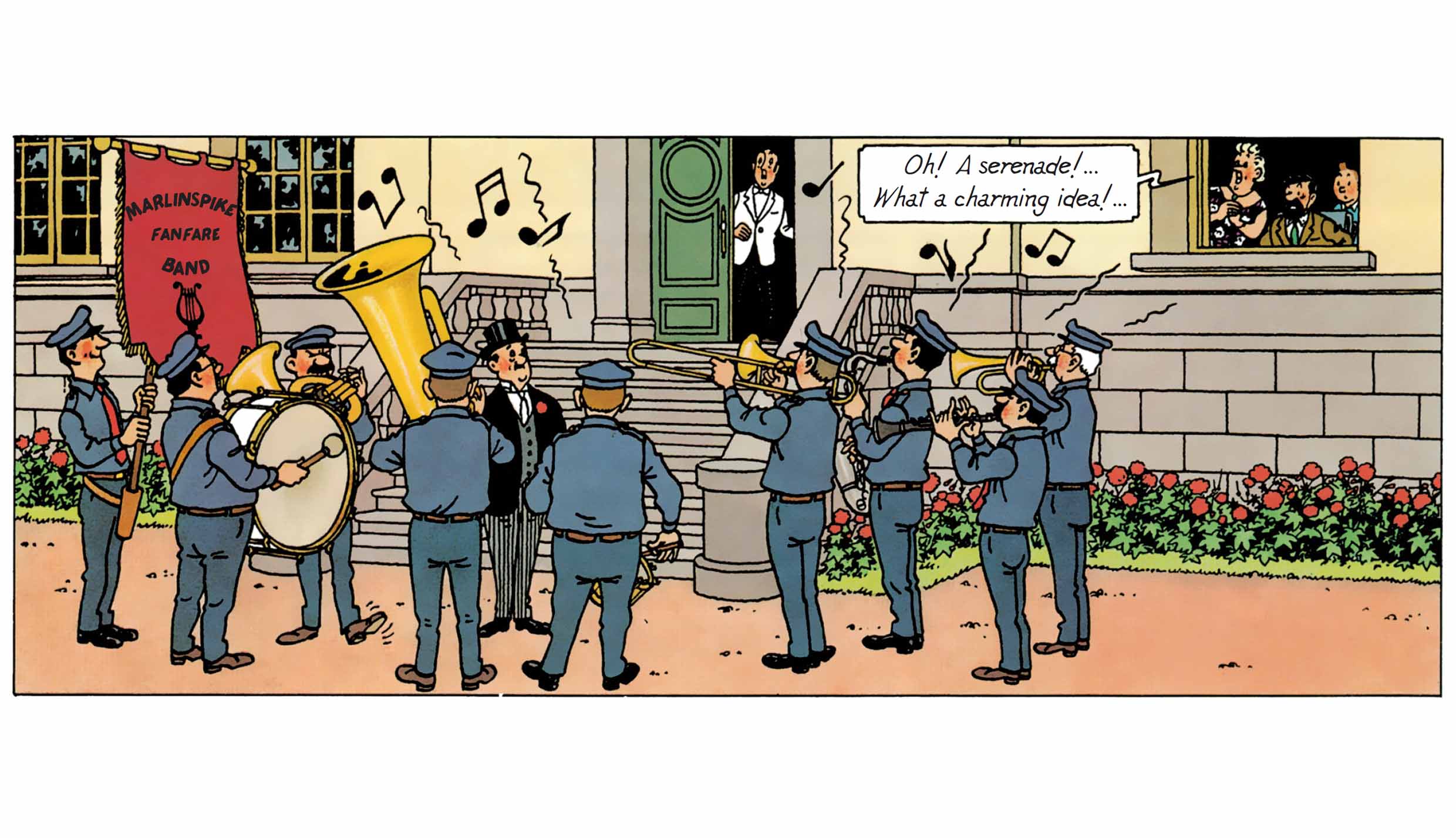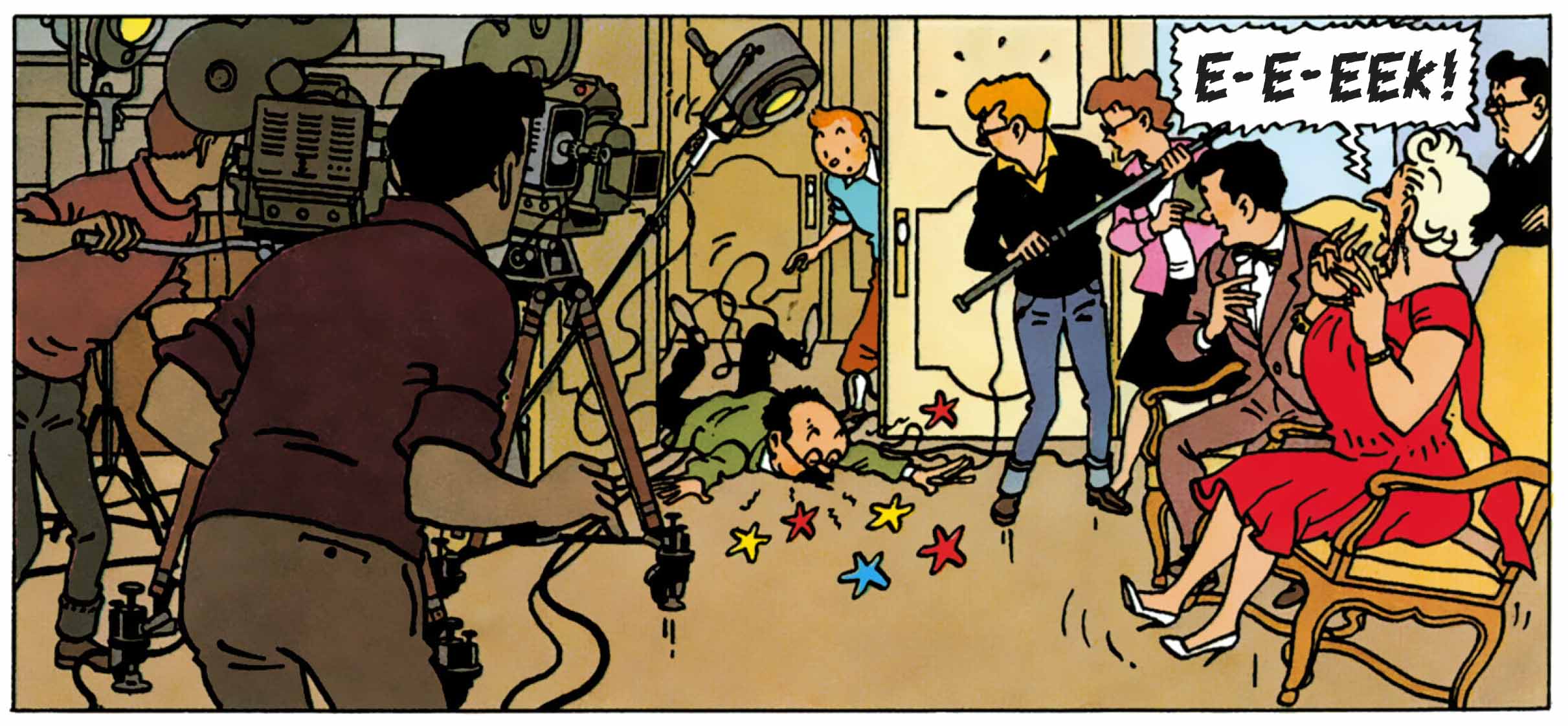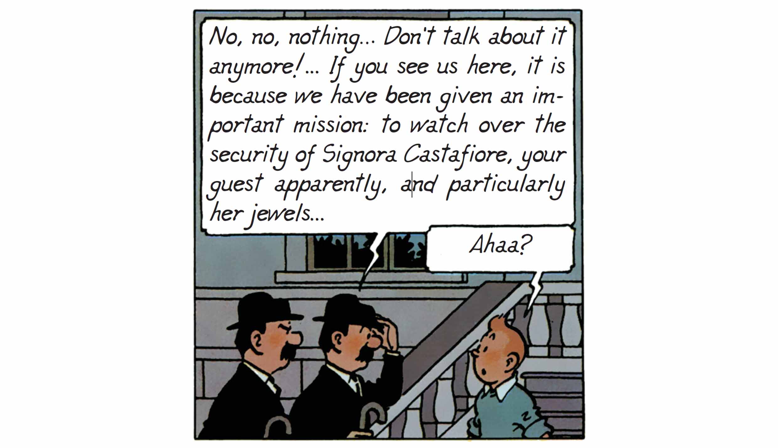 By choosing Marlinspike Hall as the sole setting for the action, Hergé tackles the narrative challenge of the closed-room drama, but with visual tools borrowed from theatre and comedic cinema: pratfalls, sound effects, repetitions, misunderstandings, situational comedy, and above all, the precisely timed choreography of entrances and exits. Each page unfolds like a boulevard play: the characters bustle about, misinterpret one another, make accusations — yet never truly advance.