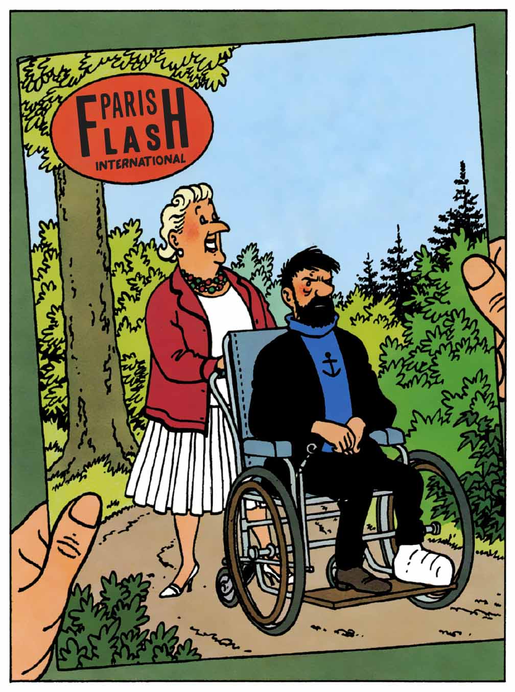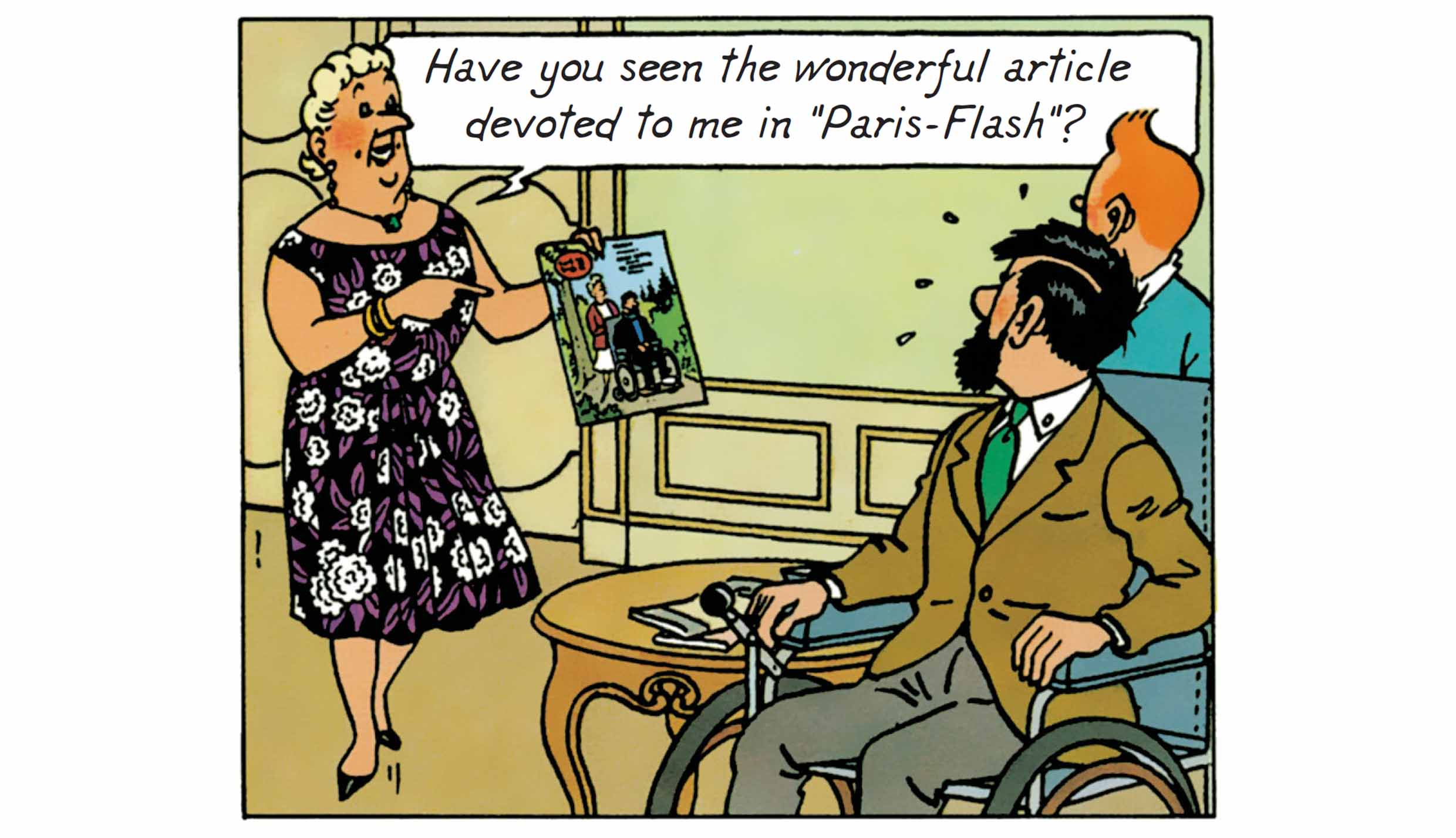 From the moment the journalists from Paris-Flash International, one of the narrative threads of the story is established: the gap between reality and representation. Castafiore has not actually invited the press — she discovers the newspaper’s presence through an article published without her consent, announcing supposed engagement plans with Captain Haddock. The humor immediately springs from this fabricated news, which deeply embarrasses the Captain and only faintly flatters the diva. This episode highlights the media’s distorting role: a simple visit is spun into a romantic affair, and the misunderstanding becomes public and uncontrollable.