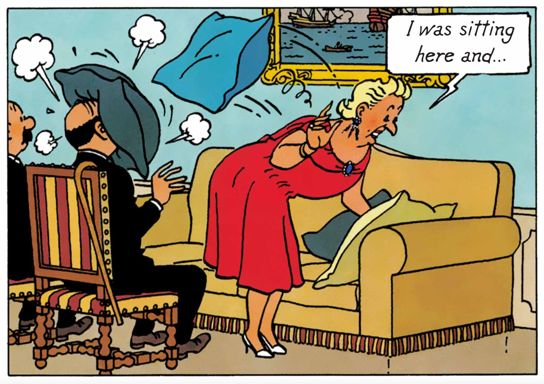 This apparent emptiness is offset by a tightly constructed comic structure, based on repetition, interpersonal tensions, and internal movement within the château. Hergé borrows the codes of boulevard theatre: entrances and exits, misunderstandings, hushed domestic squabbles, and revelations without consequences. He shifts the usual narrative stakes to better explore situational comedy.