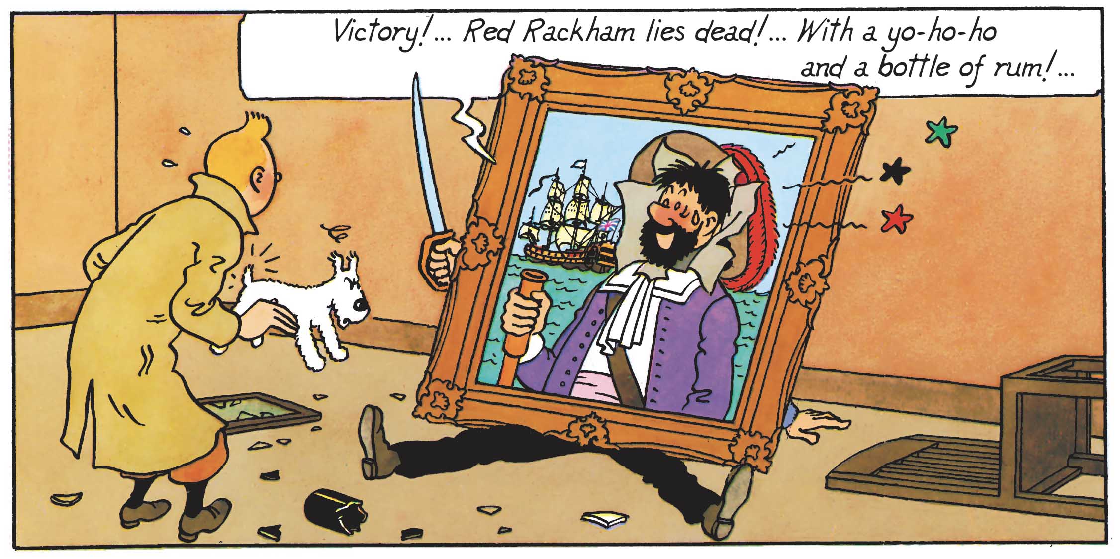 This staging condenses several dimensions of the narrative. It reminds us that Haddock is not just a hot-tempered sailor met by chance, but now a character tied to a genealogy. His simple face thus becomes a seal of filiation: in an instant, Hergé grants his captain a past, a memory, and a name anchored in time… along with a bump on his head.