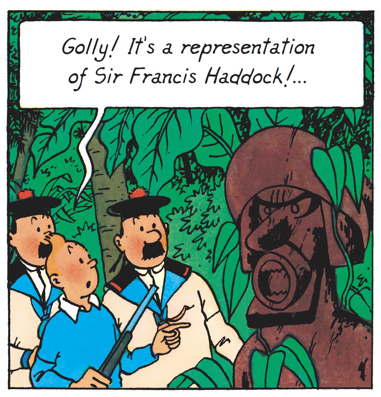 Thus Hergé turns a panel into a document, giving weight to fiction, inscribing a character into long-term history. These images sometimes become, as here, true archival pieces of an imaginary world… But wait, the collection is still missing a piece… yes, an exotic fetish that looks exactly like Sir Francis Haddock. Squint your eyes, and you’ll never spot the trick!