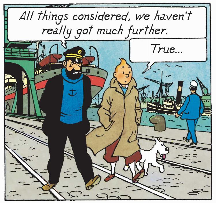 The composition, faithfully inspired by a scene from The Seven Crystal Balls (page 56, vignette C2), captures a lively moment full of motion. Tintin and Snowy seem carried by the sea breeze of Saint-Nazaire – a wind from the open sea that can be sensed in the gesture, the line and the dynamic stance of both characters.