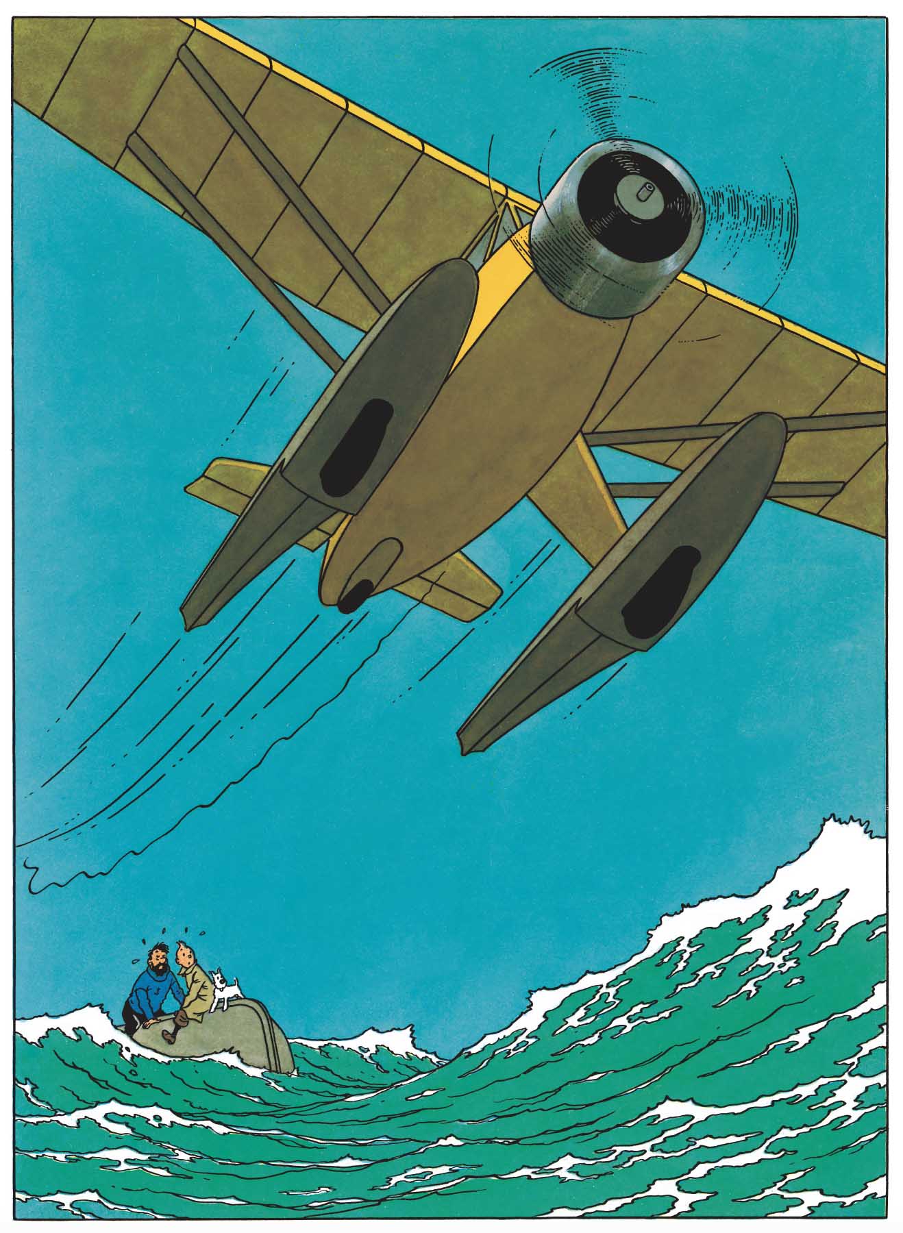 On a boat tossed by the waves, Tintin, accompanied by a gruff captain he has just met for the first time, faces the empty horizon and mounting exhaustion… before an aircraft suddenly appears in the sky! In The Crab with the Golden Claws, Hergé stages Tintin and Captain Haddock on a lifeboat, as a seaplane passes above them.