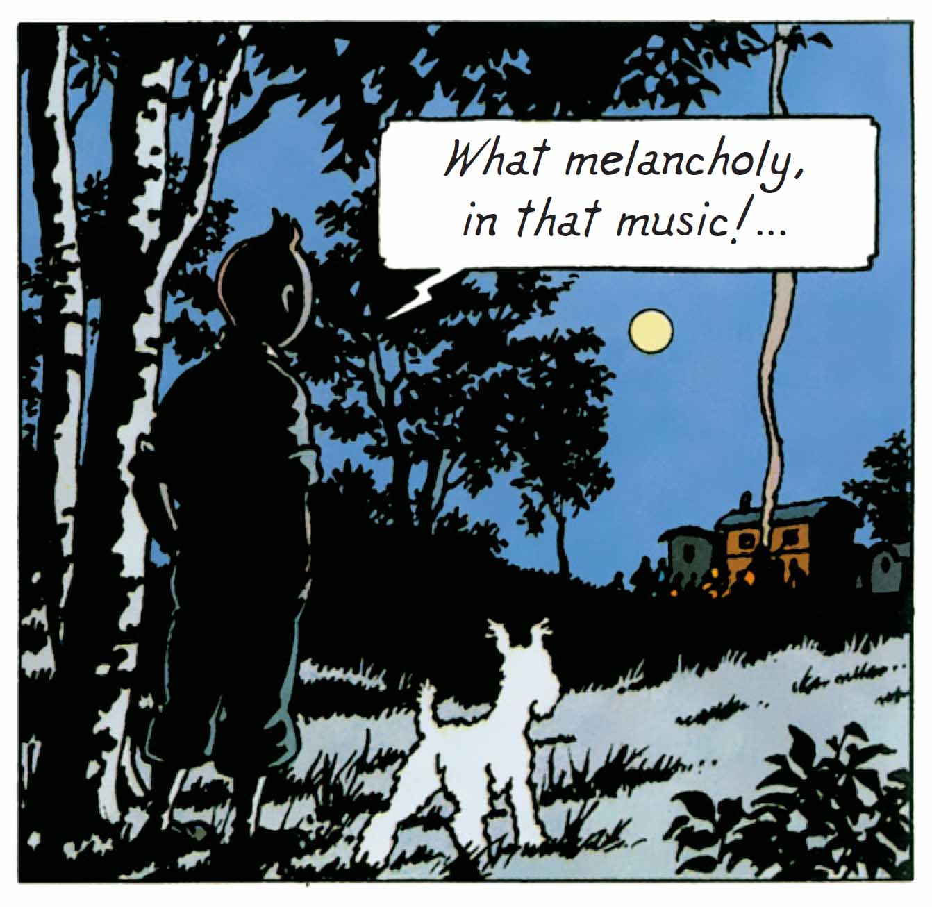 The silent face-off with the yeti in Tintin in Tibet offers a powerful image that runs counter to spectacle. The shark seen from below in Red Rackham’s Treasure, the airplane bursting from the sky in The Crab with the Golden Claws, or the diva frozen mid-aria in The Castafiore Emerald.