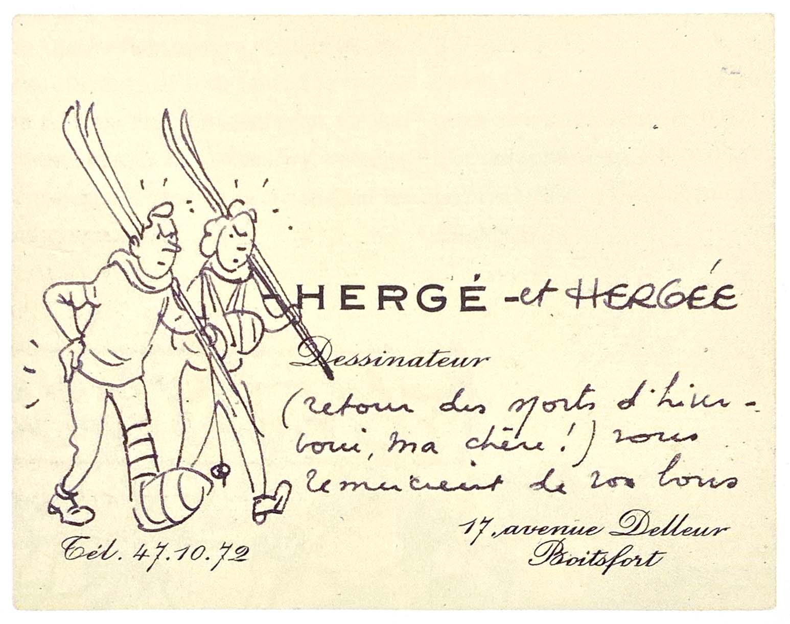 Text of the business card: Hergé and Hergée (back from winter sports, here I am!) thank you for your kind
