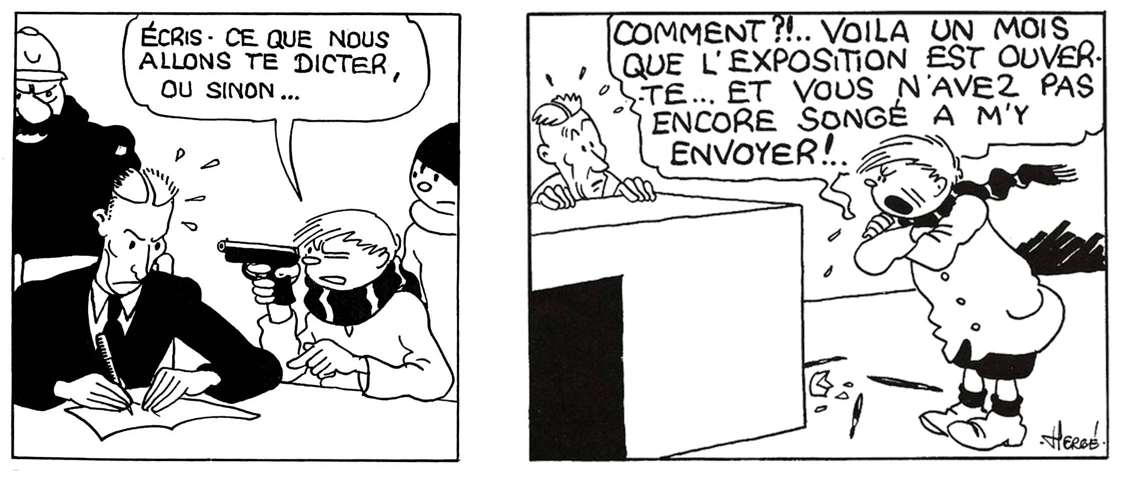 Left hand vignette text: WRITE DOWN WHAT WE ARE GOING TO DICTATE TO YOU. OR ELSE… Right hand vignette text: HOW COME?!..THE EXHIBITION HAS BEEN OPEN FOR A MONTH NOW... AND YOU HAVEN'T EVEN THOUGHT OF SENDING ME THERE YET!..