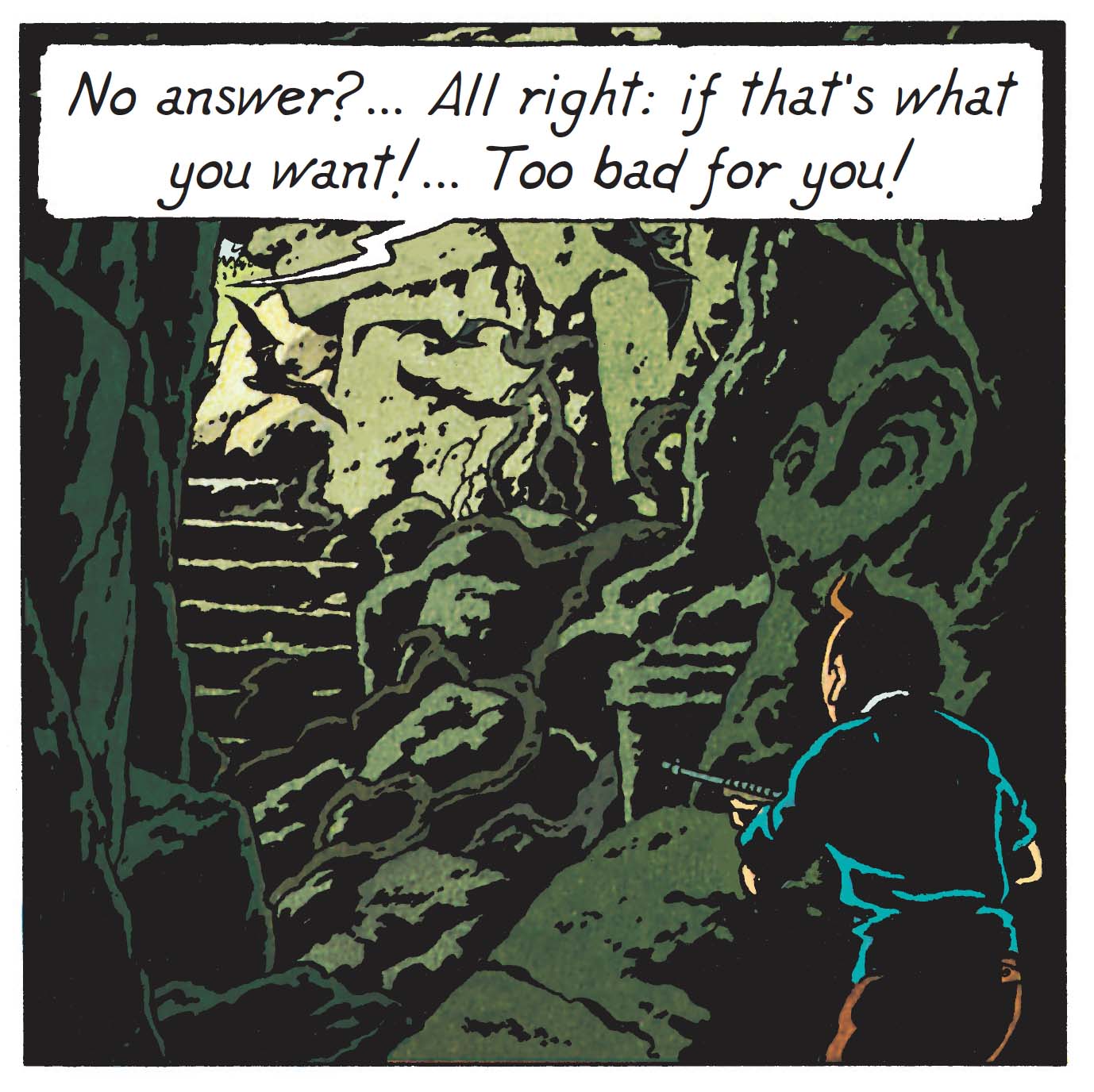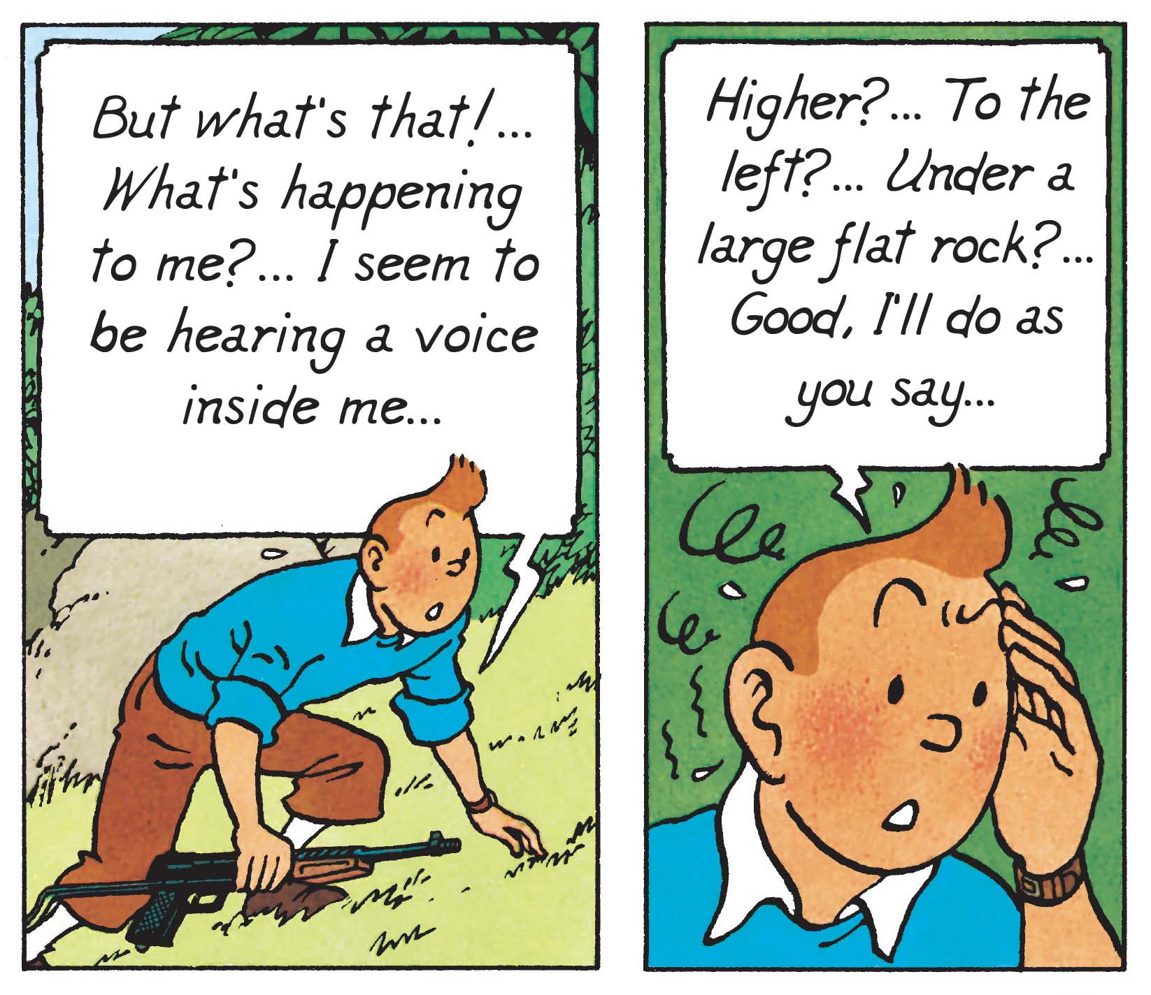 Tintin is the first to experience the inexplicable. In addition to his natural intuition and inner voice, he receives precise telepathic instructions that guide him through the jungle and its dangers. A sort of early version of a built-in GPS.