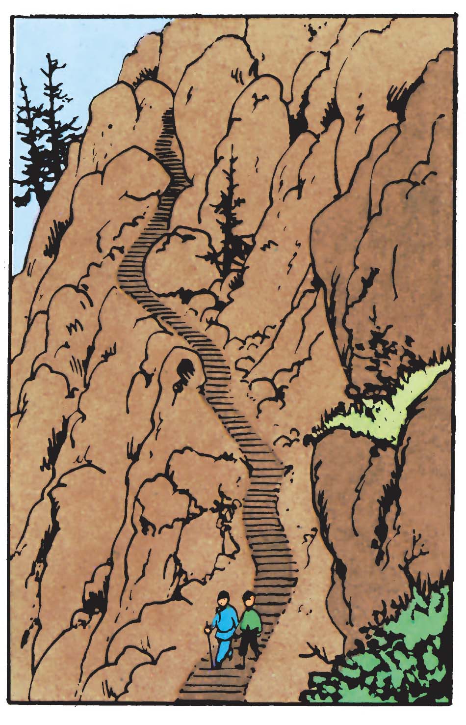 This towering mountain and the winding river are not just a tribute to that painting. Hergé reshapes the composition, retains its structural lines, and distills it into a refined image in which a striking idea remains: man is no longer at the center, but becomes a mere element within the landscape.