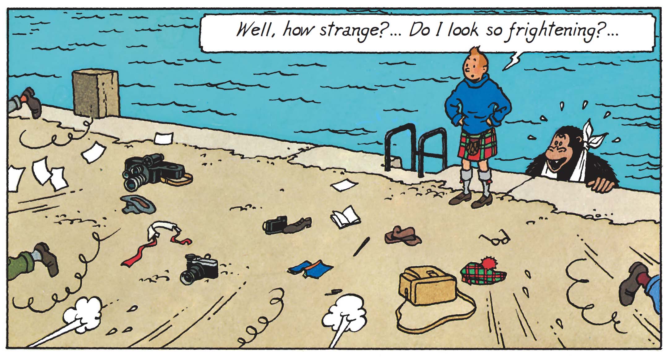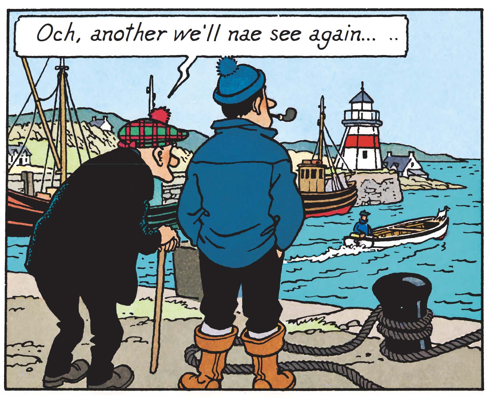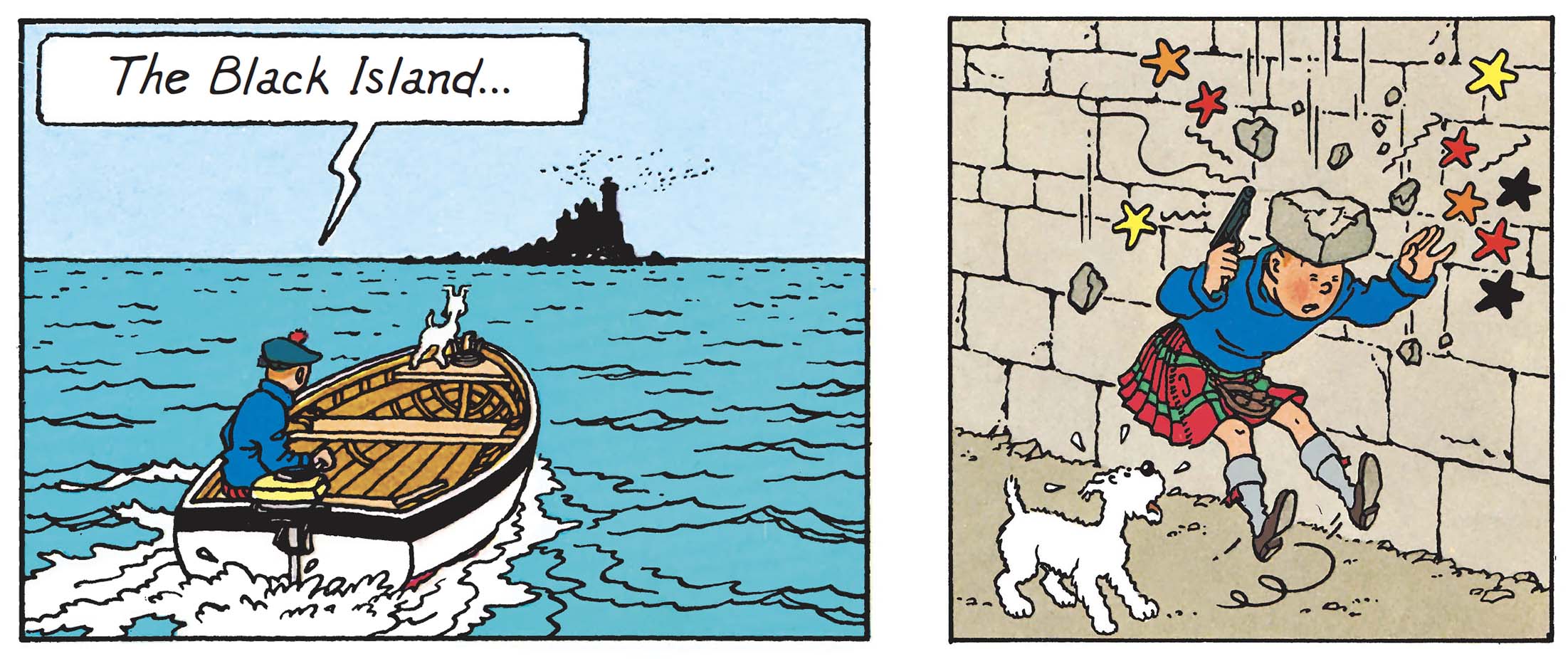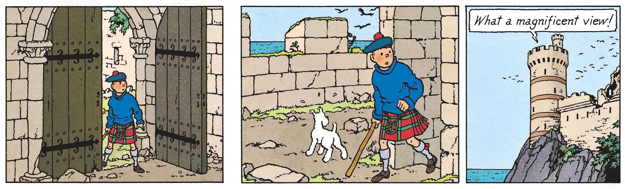 The island is not merely an isolated setting. It is constructed as a closed, almost autonomous space, where every element (terrain, access, even visibility) conditions the action. One cannot help but smile at the sight of Tintin in his Scottish attire, which immediately imposes a different sense of time.
