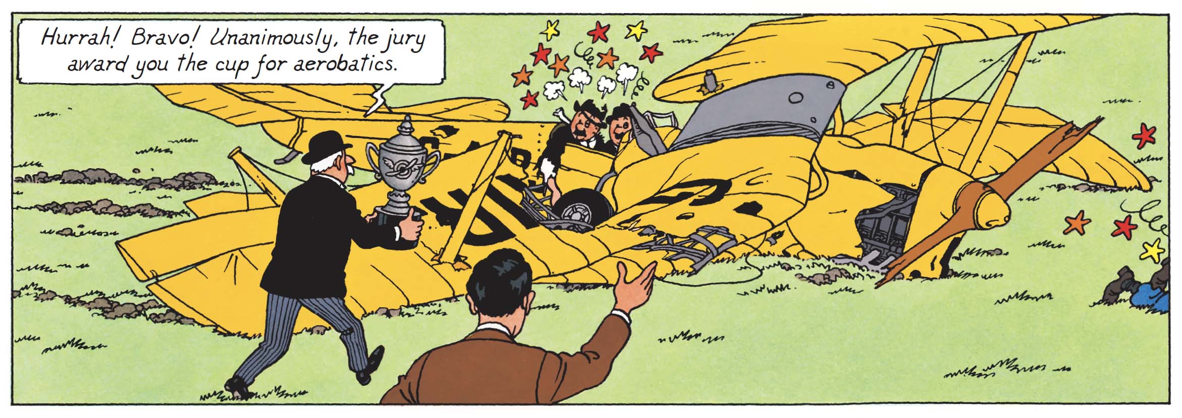 How could one fail to mention the two detectives, who miss no opportunity to render Tintin’s investigation, if not more difficult, then certainly more baroque than usual. Between mistaken accusations and blurred identities, the entire comic theatre contributes to this instability. In this respect, the presence of this famous duo of bungling investigators is far from incidental. By pursuing the man they believe guilty, they prolong the play of appearances and become its unwitting agents.