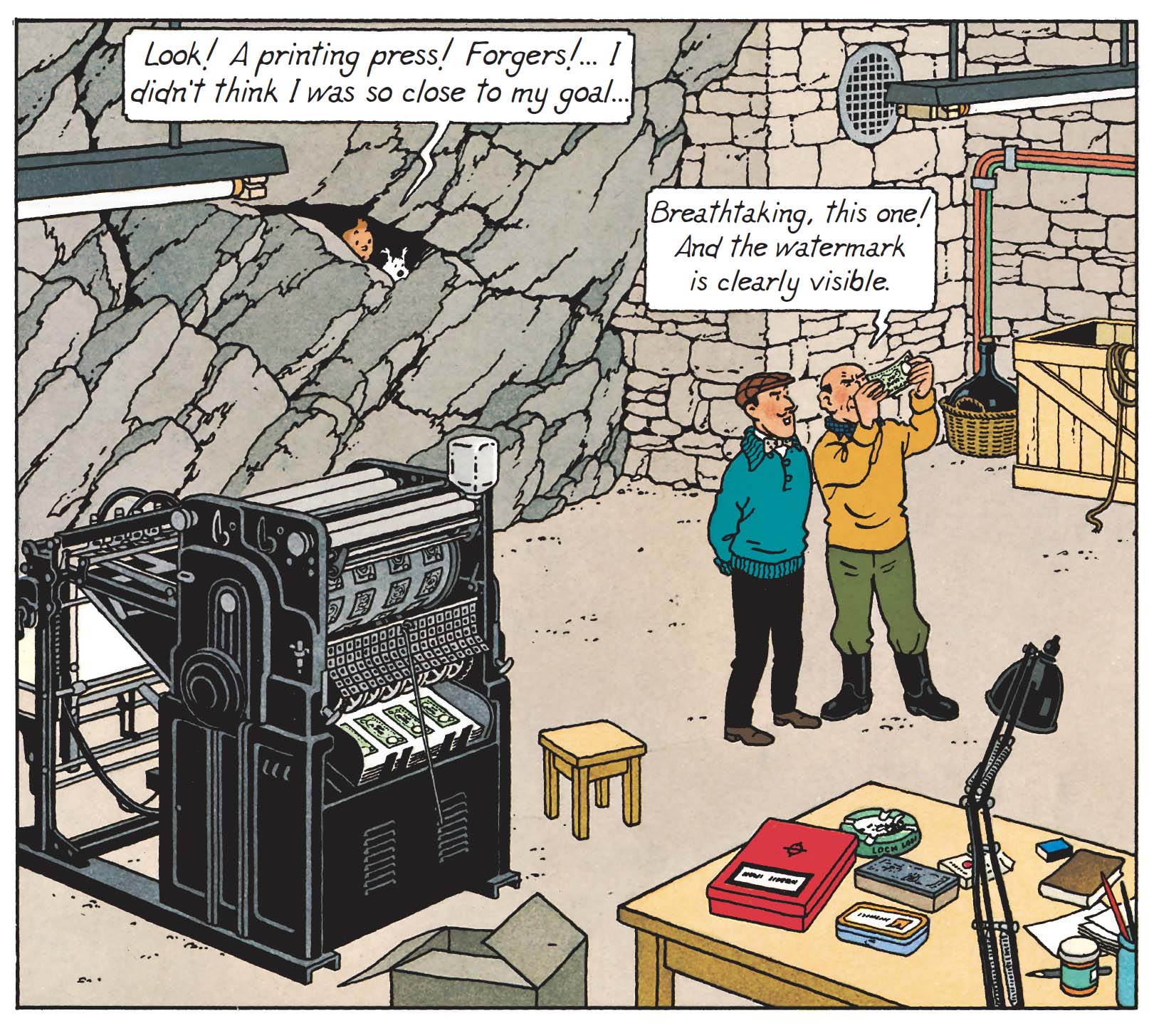 This evolution is accompanied by a methodical approach to the settings. Hergé retains control over the characters, while relying extensively on his collaborators: Bob de Moor for architecture and landscapes, Roger Leloup for aircraft, and Michel Demarets for technical elements such as the counterfeiters’ press.