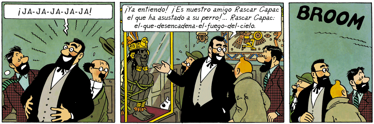 El señor Sergio Purin, investigador asociado del departamento de Arqueología los Museos Reales de Arte e Historia de Bruselas, nos recuerda que los incas tenían por costumbre momificar a los gobernantes y conservarlos en el Coricancha (el Recinto de Oro). Fuente: Catálogo del recorrido «Cuando la historieta se inspira en los objetos del museo», en el Museo del Cincuentenario.