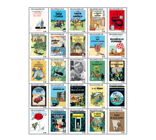 Les 25 timbres, correspondant aux 24 couvertures des albums des aventures du célèbre journaliste, ont été édités à l'occasion du centenaire de la naissance d'Hergé. Un portrait de l'auteur, a été reproduit au centre du feuillet. Les différents timbres ont été édités chacun dans une langue différente, choisie en général en fonction des pays où se déroulent les aventures illustrées. Année de sortie : 2007 Cote : nc