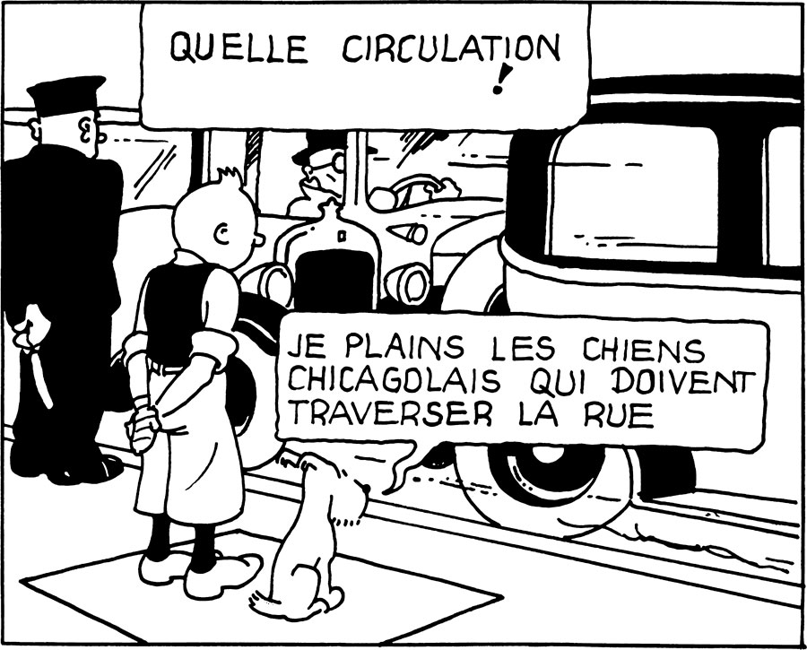 Tintin au quotidien < Dimanche 18 octobre 2020 > © Hergé - Moulinsart 2026 Traffic jam. Nous pouvons sentir l’incroyable vitalité de la ville qui souffle sur la tête de Milou. +9 Le pays où la voiture est reine. © Moulinsart 2020