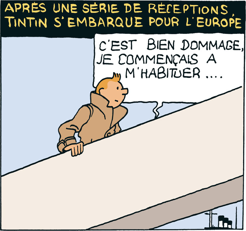 Tintin au quotidien < Dimanche 15 novembre 2020 > © Hergé - Moulinsart 2026 Tintin quitte l’Amérique pour de bon avec nostalgie et une envie de retour. +5 Washington © Moulinsart 2020