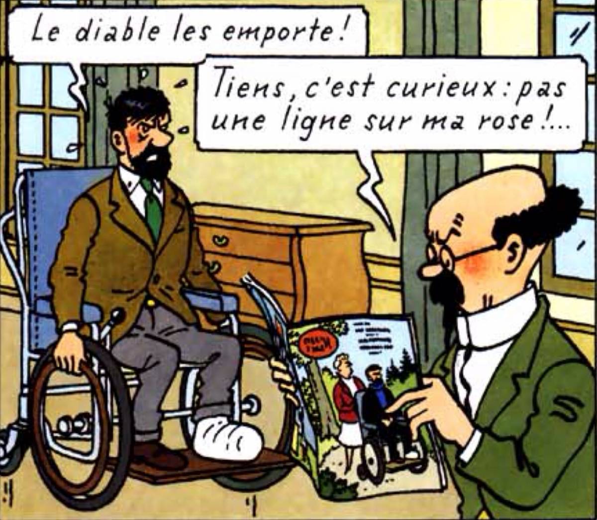 Le professeur lit le journal "Paris Flash", où il ne voit aucune ligne sur sa rose... Bijoux de la Castafiore, page 28 C2.